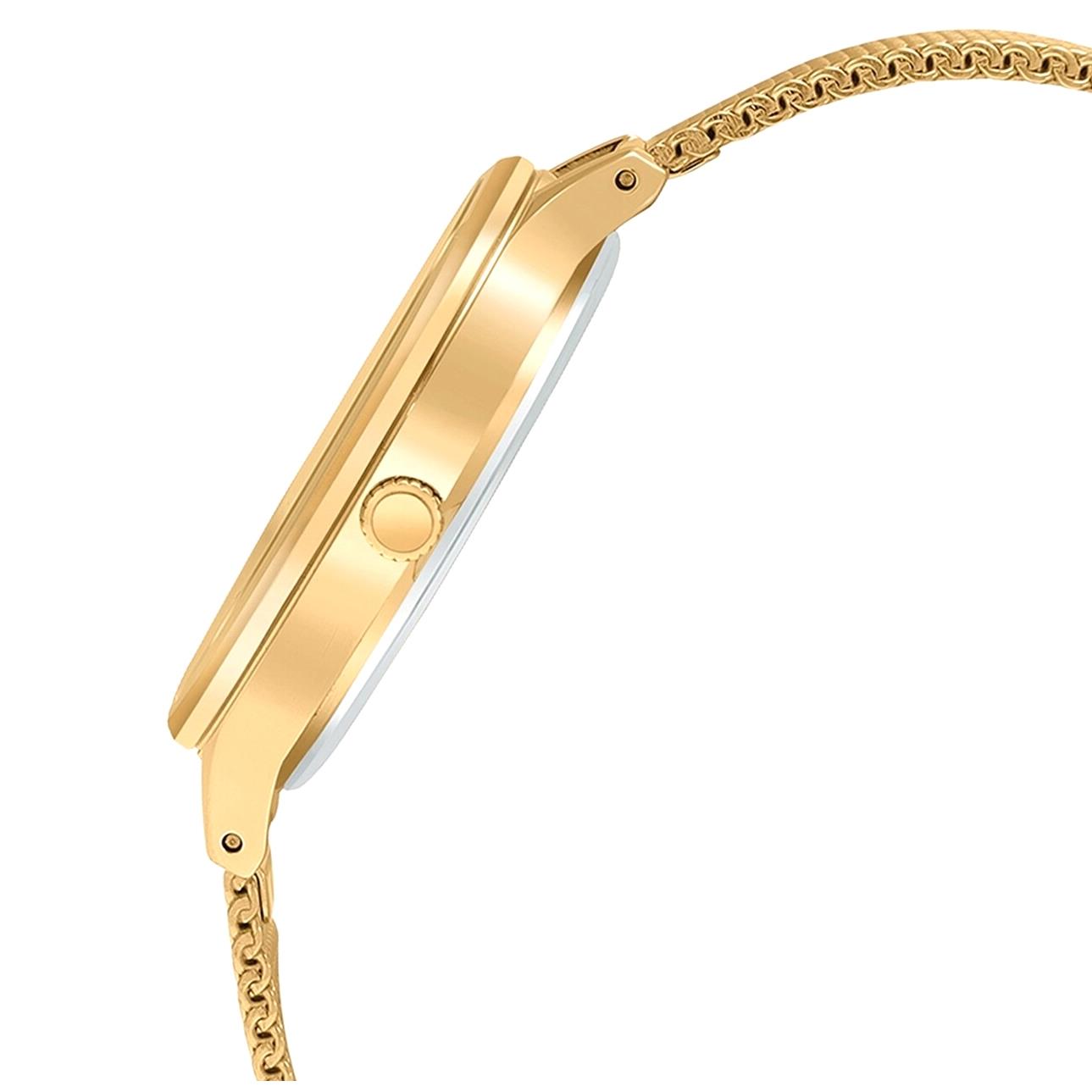 ساعت مچی زنانه کاسیو casio با طراحی روزانه بند حصیر بافت طلایی با قاب گرد طلایی و صفحه طرحدار کرمی با شیشه ضد خراش و موتور ژاپنی با انرژی باتری و مقاوم در برابر آب تا عمق 50 متر به همراه گارانتی بین المللی