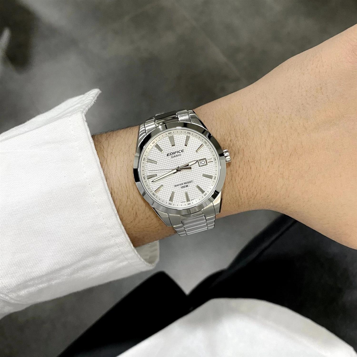ساعت مچی مردانه کاسیو casio با طراحی روزانه بند استیل با قاب گرد استیل و صفحه سفید  و قابلیت تقویم شب نما و موتور ژاپنی با اترژی باتری و مقاوم در برابر آب تا عمق 100 متر به همراه گارانتی بین المللی