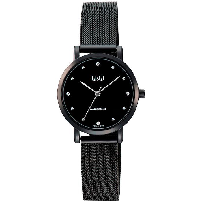 ساعت مچی زنانه کیو اند کیو QQ با طراحی روزانه بند حصیربافت مشکی و قاب فلزی مشکی و صفحه نگین دارمشکی و موتور ژاپنی با انرژی باطری و مقاوم در برابر آب تا عمق 30 متر به همراه یک سال گارانتی شرکتی