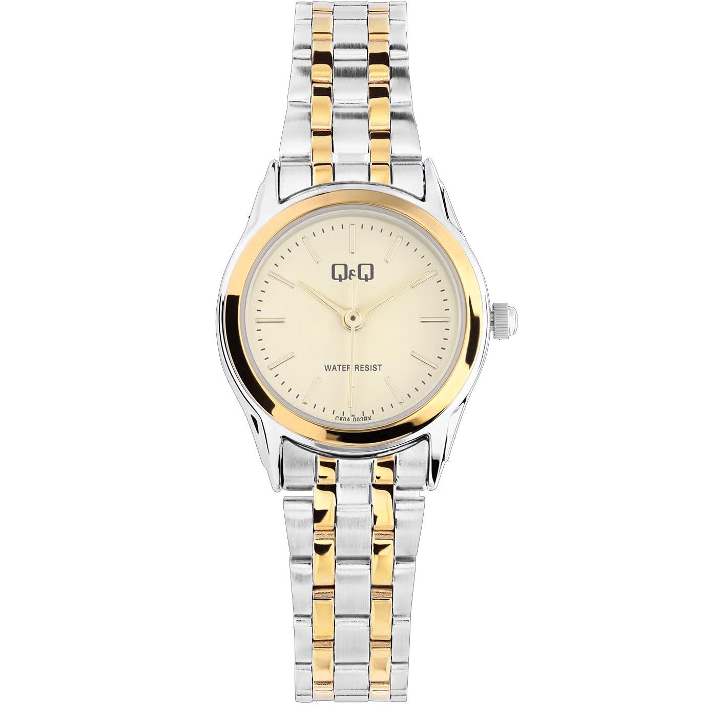 ساعت مچی زنانه کیو اند کیو QQ با طراحی روزانه بند دو رنگ و قاب دو رنگ و صفحه گرد کرم و موتور ژاپنی با انرژی باطری و مقاوم در برابر آب تا عمق 30 متر به همراه یک سال گارانتی شرکتی