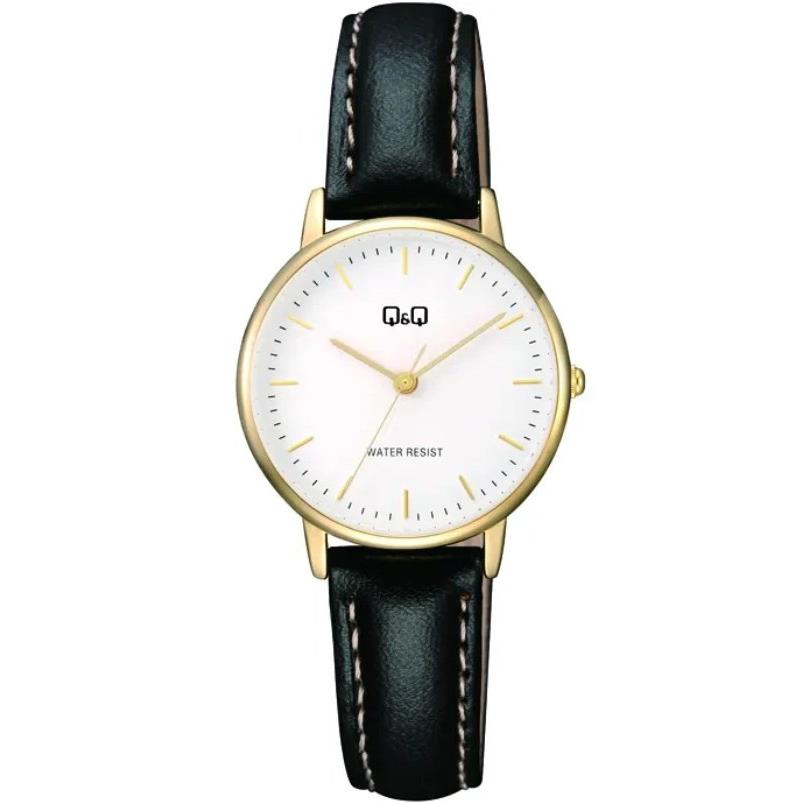 ساعت مچی زنانه کیو اند کیو QQ با طراحی روزانه بند چرمی مشکی و قاب فلزی طلایی و صفحه سفید و موتور ژاپنی با انرژی باطری و مقاوم در برابر آب تا عمق 30 متر به همراه یک سال گارانتی شرکتی
