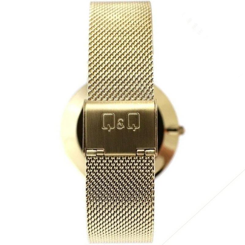 ساعت مچی زنانه کیو اند کیو QQ با طراحی روزانه بند حصیر بافت طلایی و قاب طلایی و صفحه سرمه ای و موتور ژاپنی با انرژی باطری و مقاوم در برابر آب تا عمق 30 متر به همراه یک سال گارانتی شرکتی