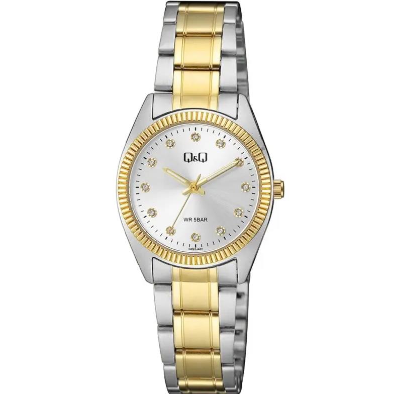 ساعت مچی زنانه کیو اند کیو QQ با طراحی کلاسیک دو رنگ بند فلزیبا قاب گرد و صفحه نگین دار نقره ای و موتور ژاپنی با انرژی باطری و مقاوم در برابر آب تا عمق 30 متر به همراه یک سال گارانتی شرکتی