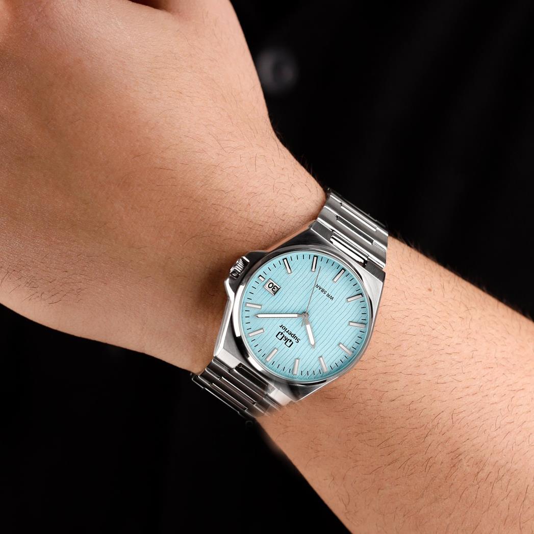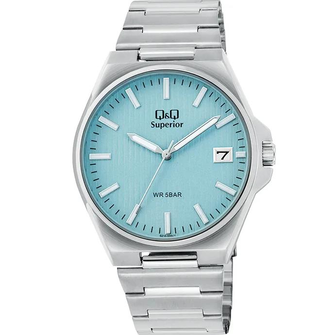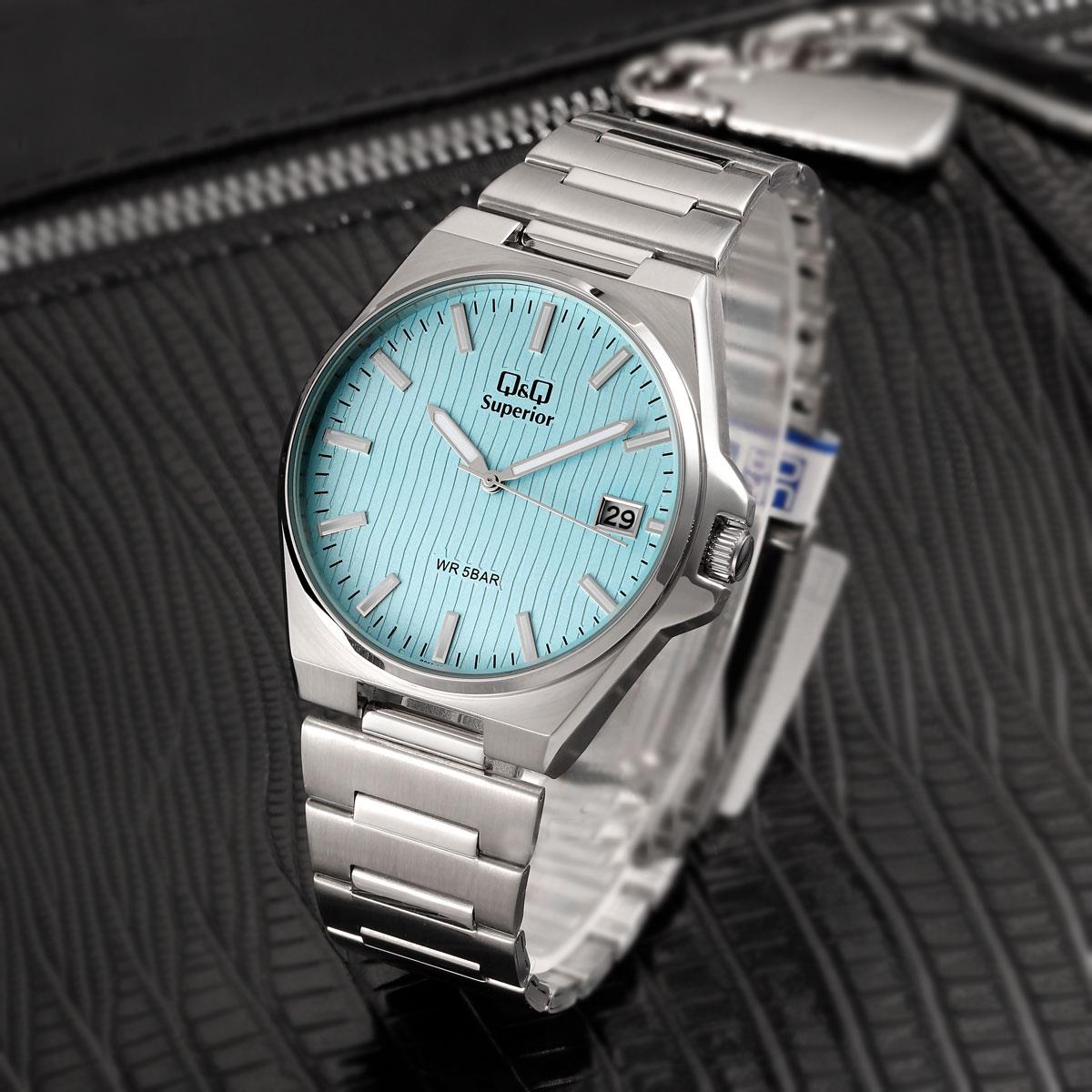ساعت مچی مردانه کیو اند کیو QQ با طراحی روزانه بند استیل و قاب گرد استیل و صفحه آبی با قابلیت داشتن شب نما / تقویم و موتور ژاپنی با انرژی باطری و مقاوم در برابر آب تا عمق 50 متر به همراه یک سال گارانتی شرکتی