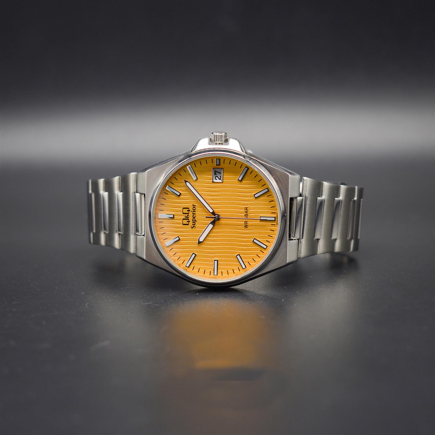 ساعت مچی مردانه کیو اند کیو QQ با طراحی روزانه بند استیل و قاب گرد استیل و صفحه زرد با قابلیت داشتن شب نما / تقویم و موتور ژاپنی با انرژی باطری و مقاوم در برابر آب تا عمق 50 متر به همراه یک سال گارانتی شرکتی