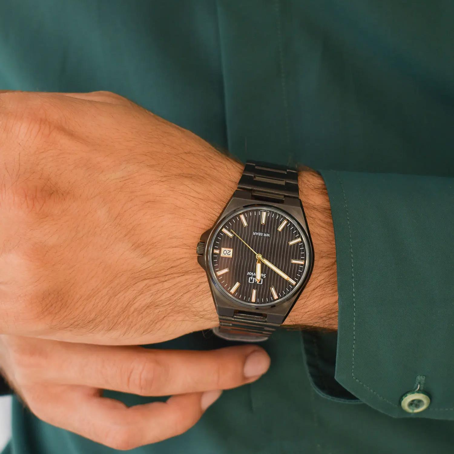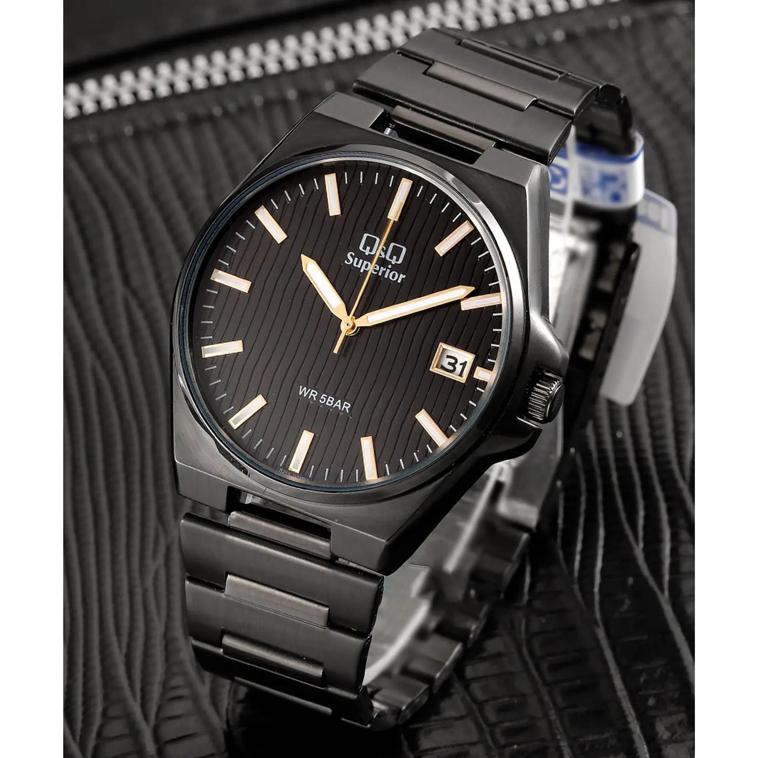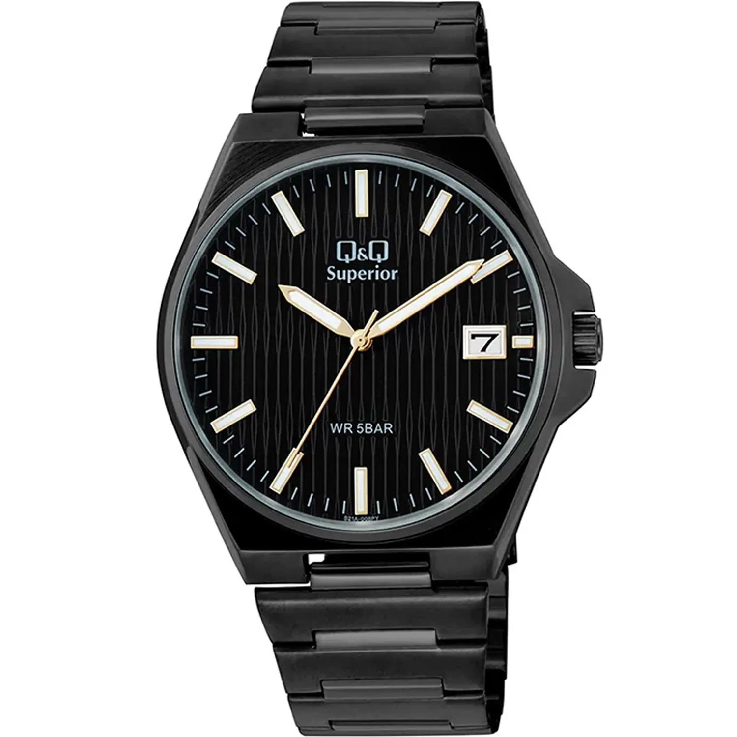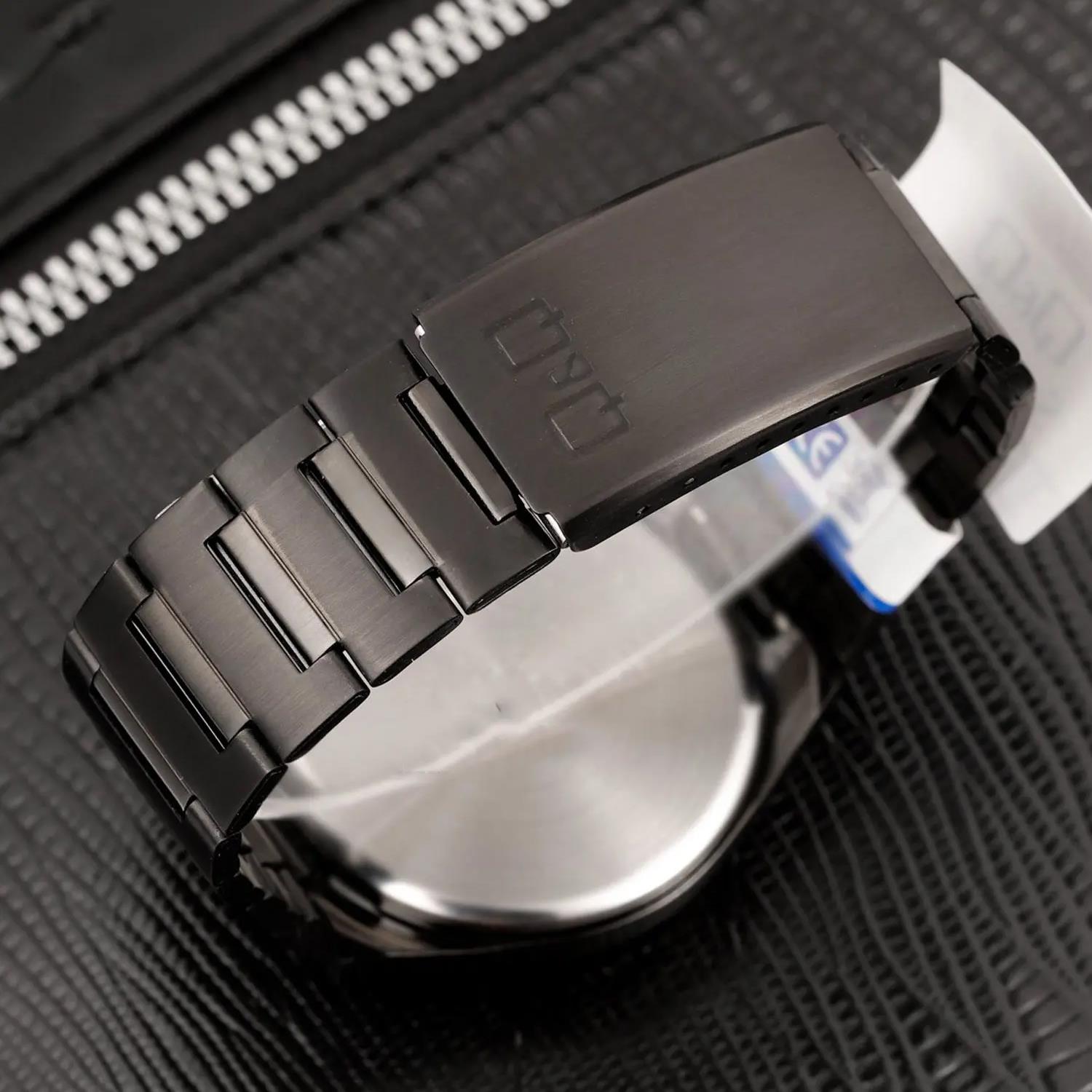 ساعت مچی مردانه کیو اند کیو QQ با طراحی روزانه بند فلزی مشکی و قاب گرد مشکی و صفحه مشکی با قابلیت داشتن شب نما / تقویم و موتور ژاپنی با انرژی باطری و مقاوم در برابر آب تا عمق 50 متر به همراه یک سال گارانتی شرکتی