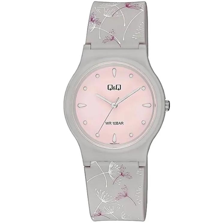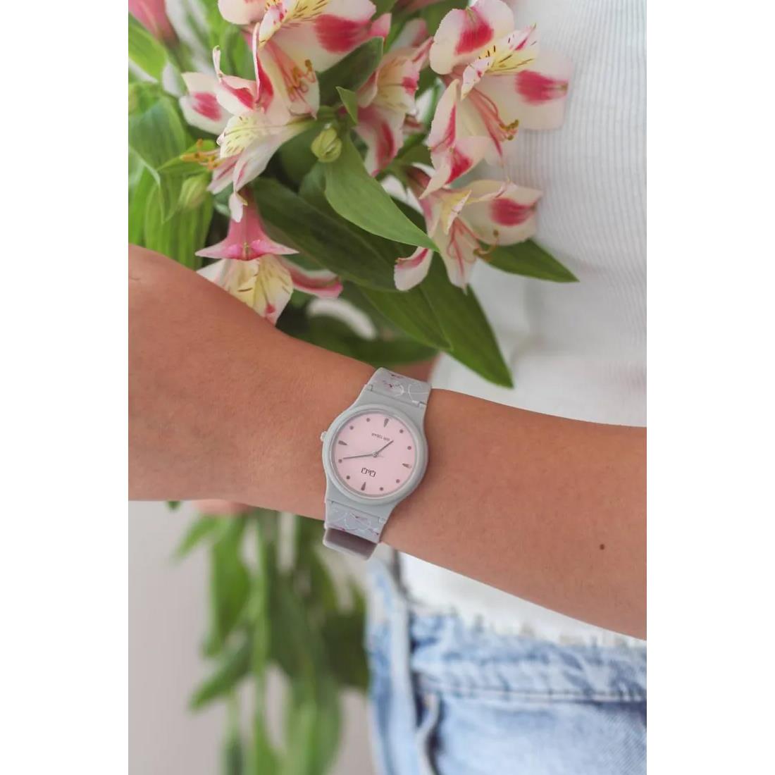 ساعت مچی زنانه کیو اند کیو QQ با طراحی روزانه بند سیلیکونی طوسی و قاب طوسی و صفحه صورتی و موتور ژاپنی با انرژی باطری و مقاوم در برابر آب تا عمق 100 متر به همراه یک سال گارانتی شرکتی