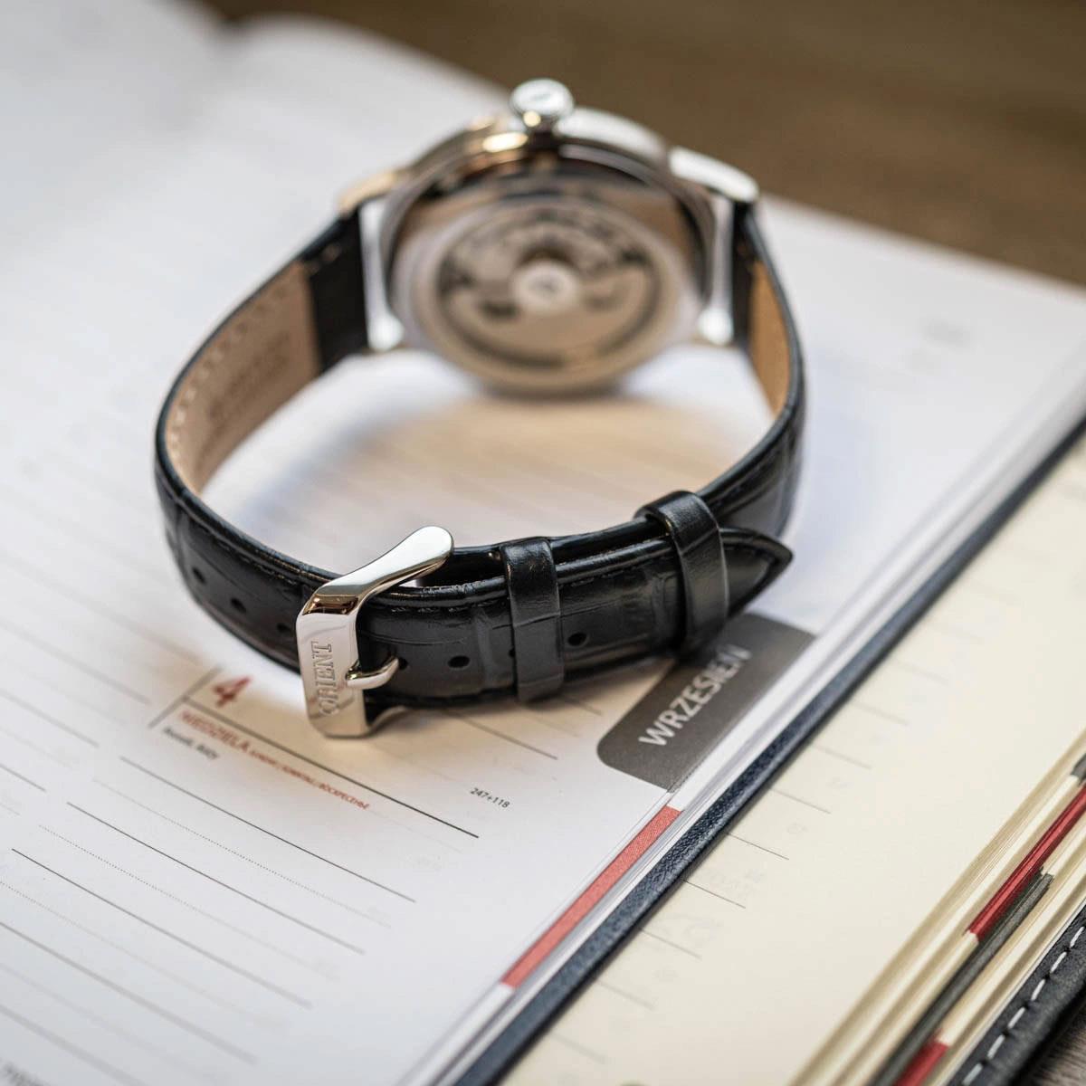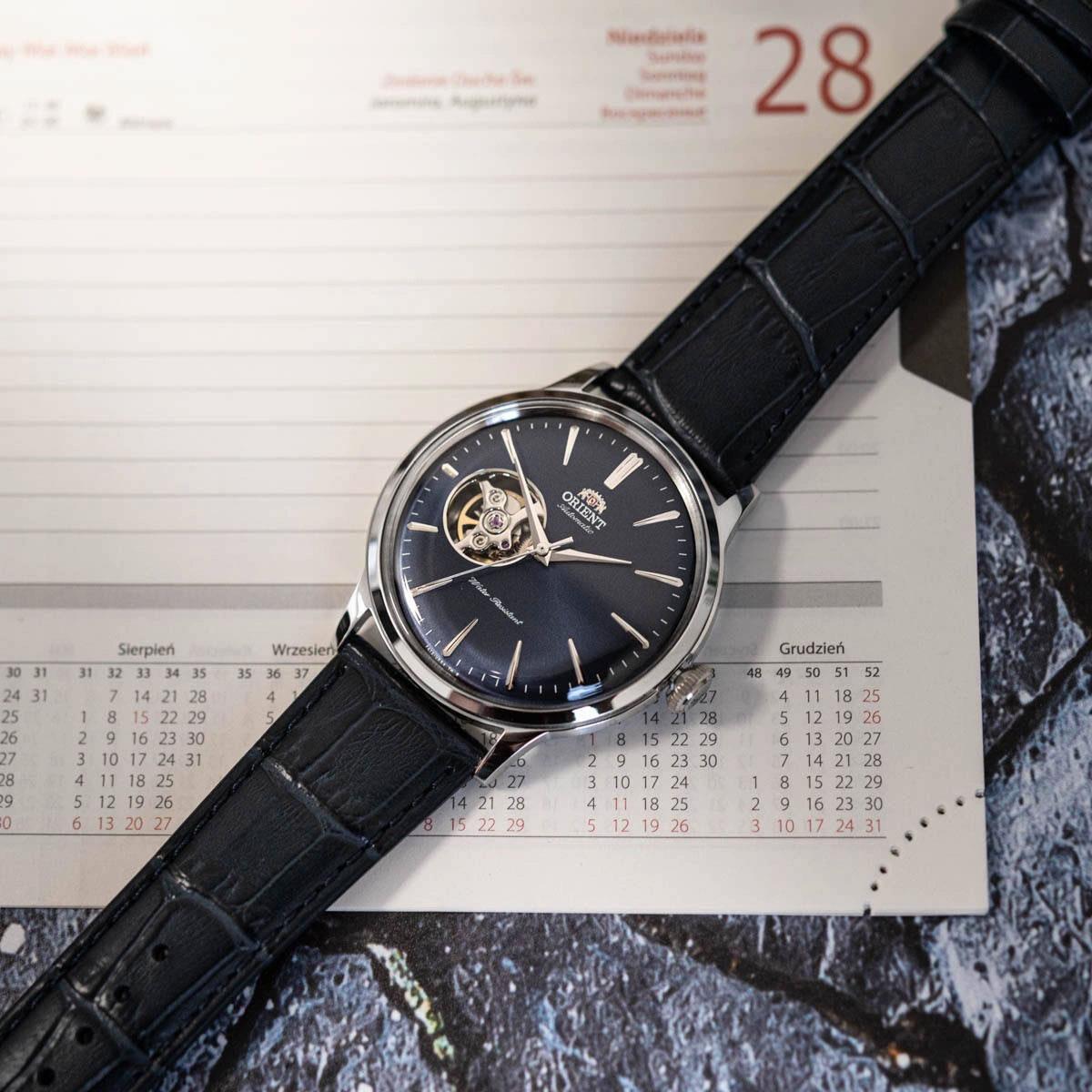 ساعت مچی مردانه اورینت orient با طراحی روزانه بند چرمی سرمه ای و قاب استیل  و صفحه قلب بازه سرمه ای و موتور اتوماتیک  ژاپنی با انرژی  مکانیکی و مقاومت در برابر آب تا عمق 30 متر به همراه  گارانتی بین المللی