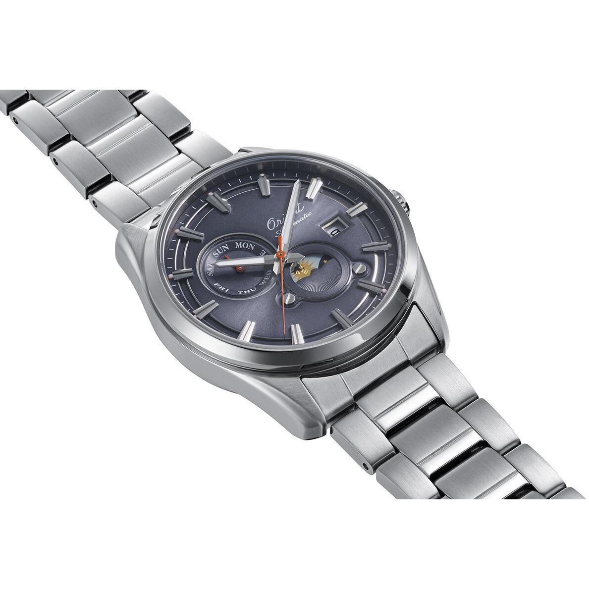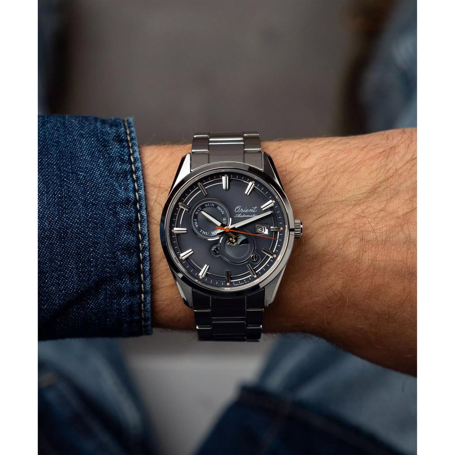ساعت مچی مردانه اورینت orient با طراحی روزانه بند استیل و قاب استیل و صفحه گرد طوسی با شیشه ضد خراش و قابلیت داشتن موقعیت کنونی ماه و ستاره / تقویم / روزهای هفته و موتور اتوماتیک ژاپنی با انرژی مکانیکی و مقاومت در برابر آب تا عمق 50 متر به همراه گارانتی بین المللی
