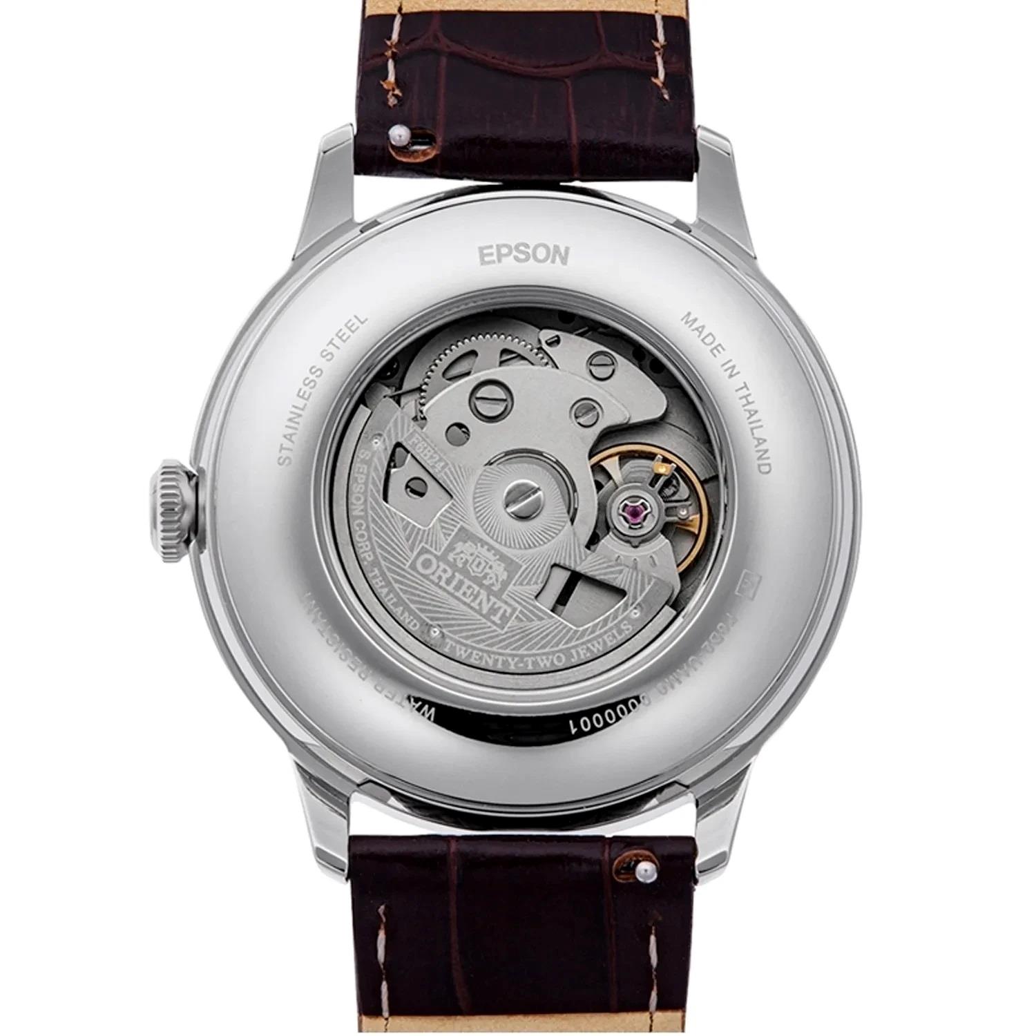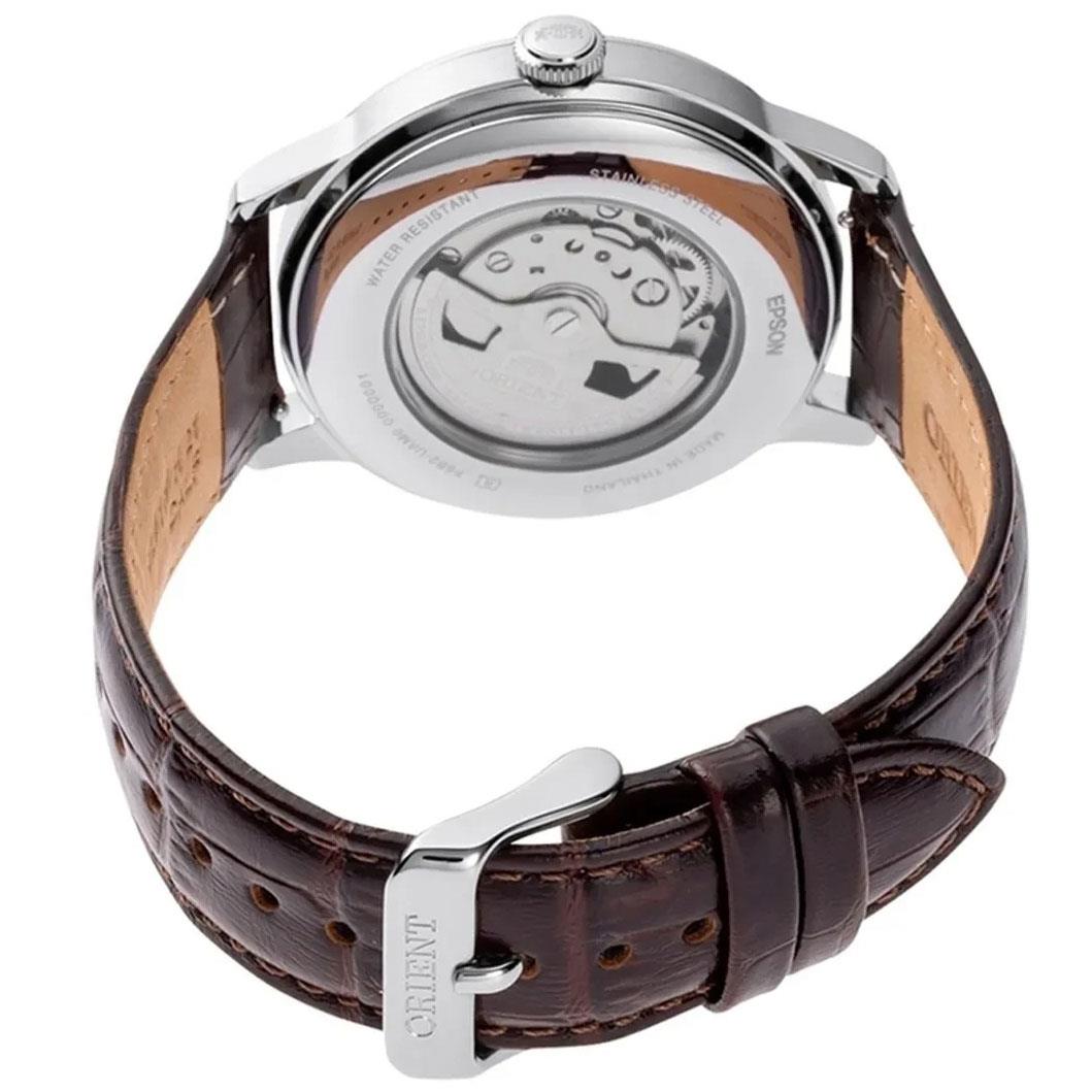 ساعت مچی مردانه اورینت orient با طراحی روزانه بند چرمی قهوه ای و قاب استیل  و صفحه گرد قهوه ای با شیشه ضد خراش و قابلیت داشتن موقعیت کنونی ماه وستاره / تقویم / روزهای هفته و موتور اتوماتیک  ژاپنی با انرژی  مکانیکی و مقاومت در برابر آب تا عمق 30 متر به همراه  گارانتی بین المللی