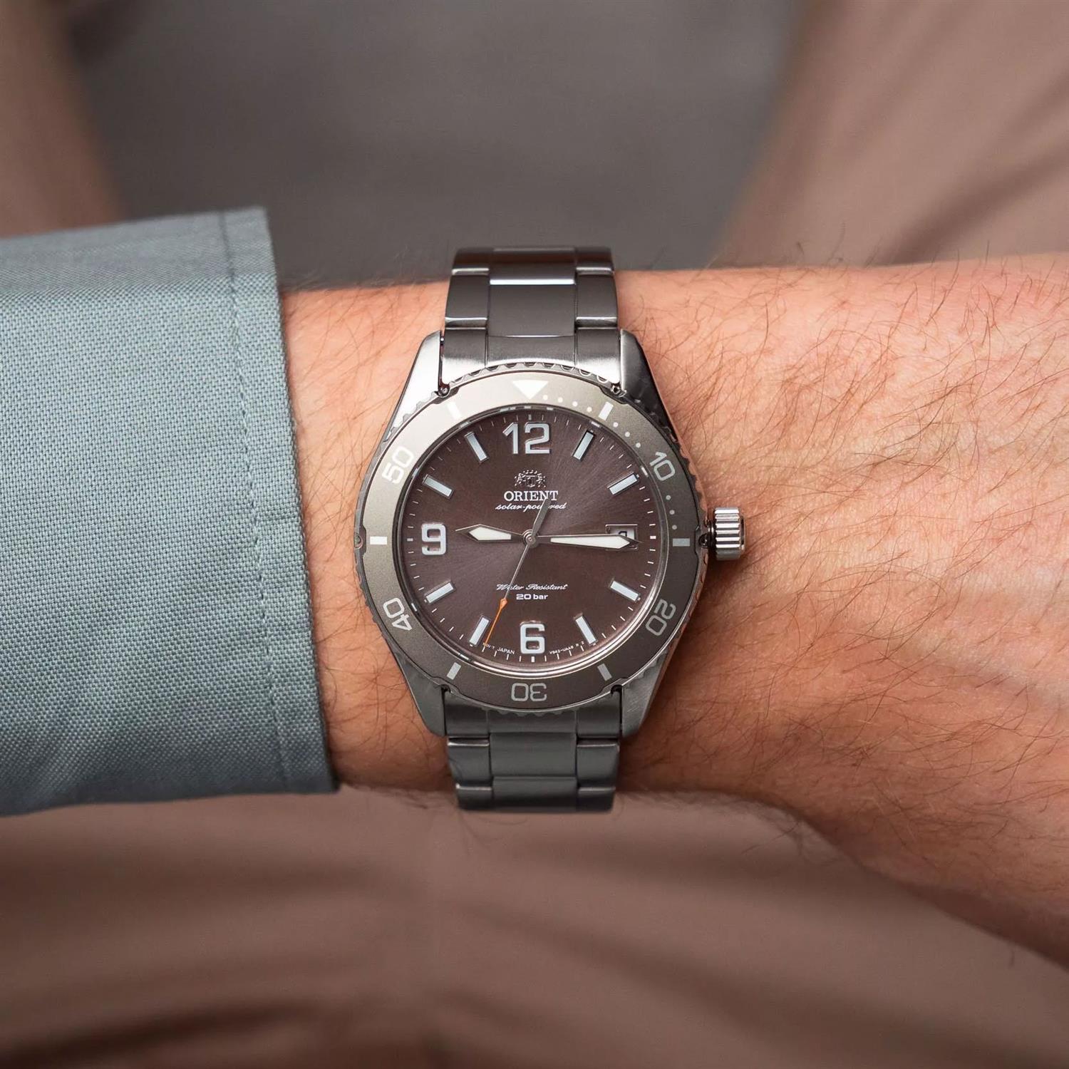 ساعت مچی مردانه اورینت orient با طراحی روزانه بند استیل و قاب دو رنگ و صفحه گرد قهوه ای با شیشه ضد خراش و قابلیت داشتن شب نما / تقویم / زه چرخان و موتور ژاپنی با انرژی خورشیدی و مقاومت در برابر آب تا عمق 200 متر به همراه گارانتی بین المللی