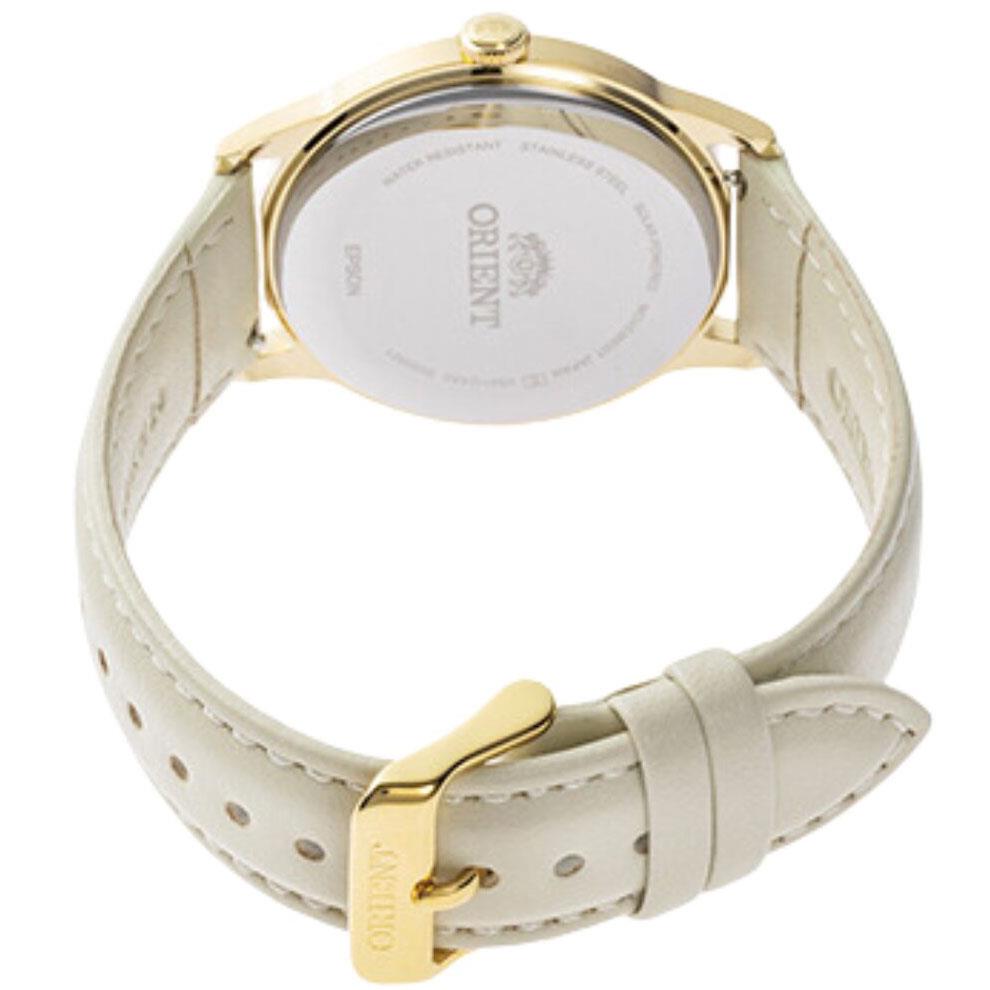 ساعت مچی زنانه اورینت orient با طراحی روزانه بند چرمی سفید و قاب فلزی طلایی و صفحه گرد سفید و موتور ژاپنی با انرژی خورشیدی و مقاومت در برابر آب تا عمق 30 متر به همراه گارانتی بین المللی