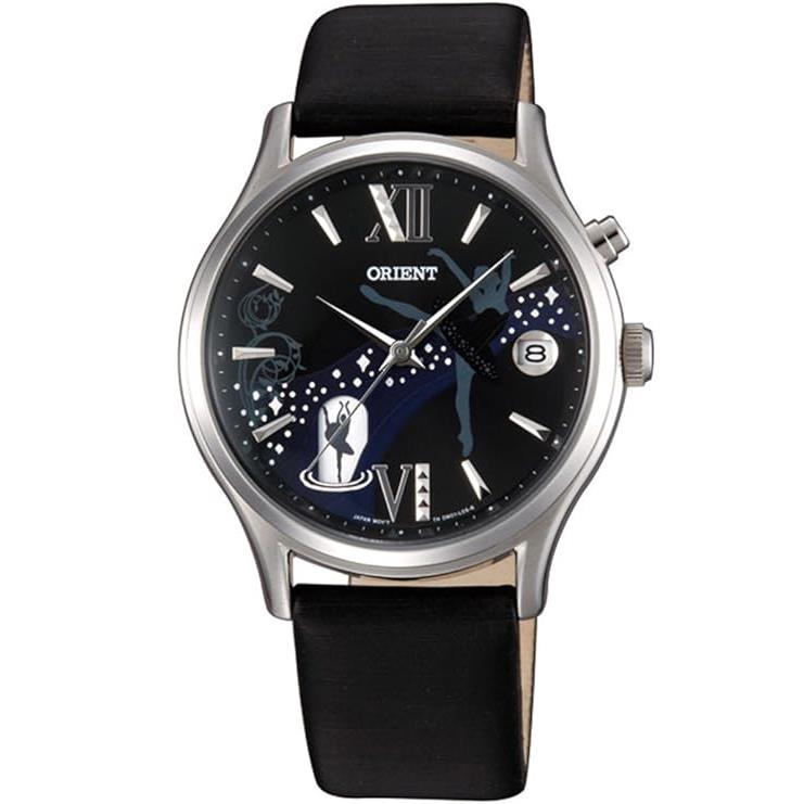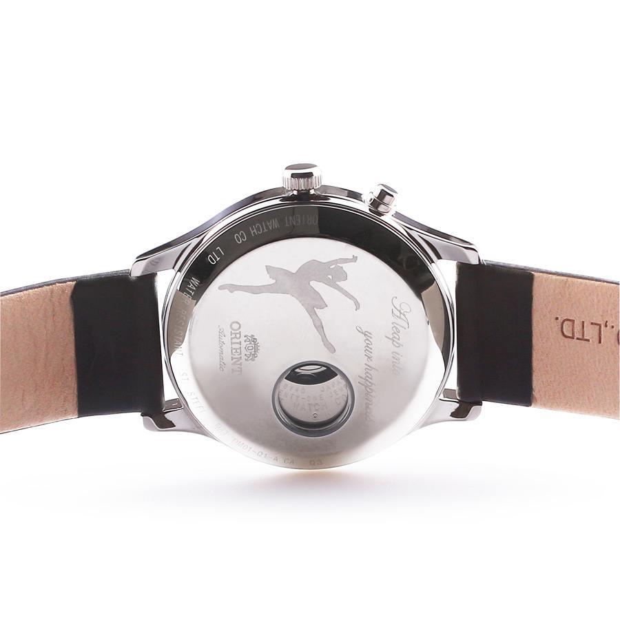 ساعت مچی زنانه اورینت orient با طراحی روزانه بند چرمی مشکی و قاب استیل و صفحه مشکی و موتور اتوماتیک ژاپنی با انرژی مکانیکی و مقاومت در برابر آب تا عمق 30 متر به همراه  گارانتی بین المللی