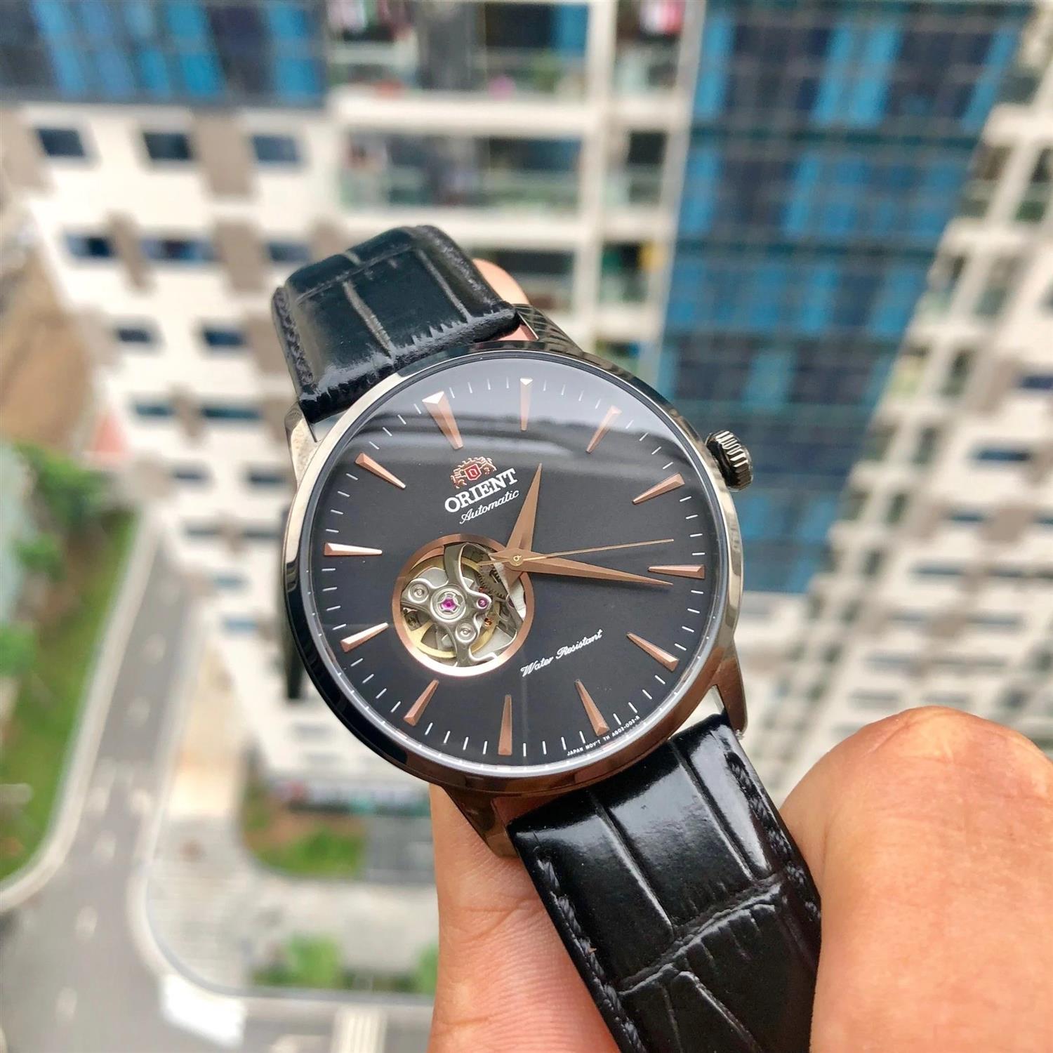 ساعت مچی مردانه اورینت orient با طراحی روزانه بند چرمی و قاب فلزی دودی و صفحه قلب بازه مشکی و موتوراتوماتیک ژاپنی با انرژی مکانیکی و مقاومت در برابر آب تا عمق 50 متر به همراه  گارانتی بین المللی