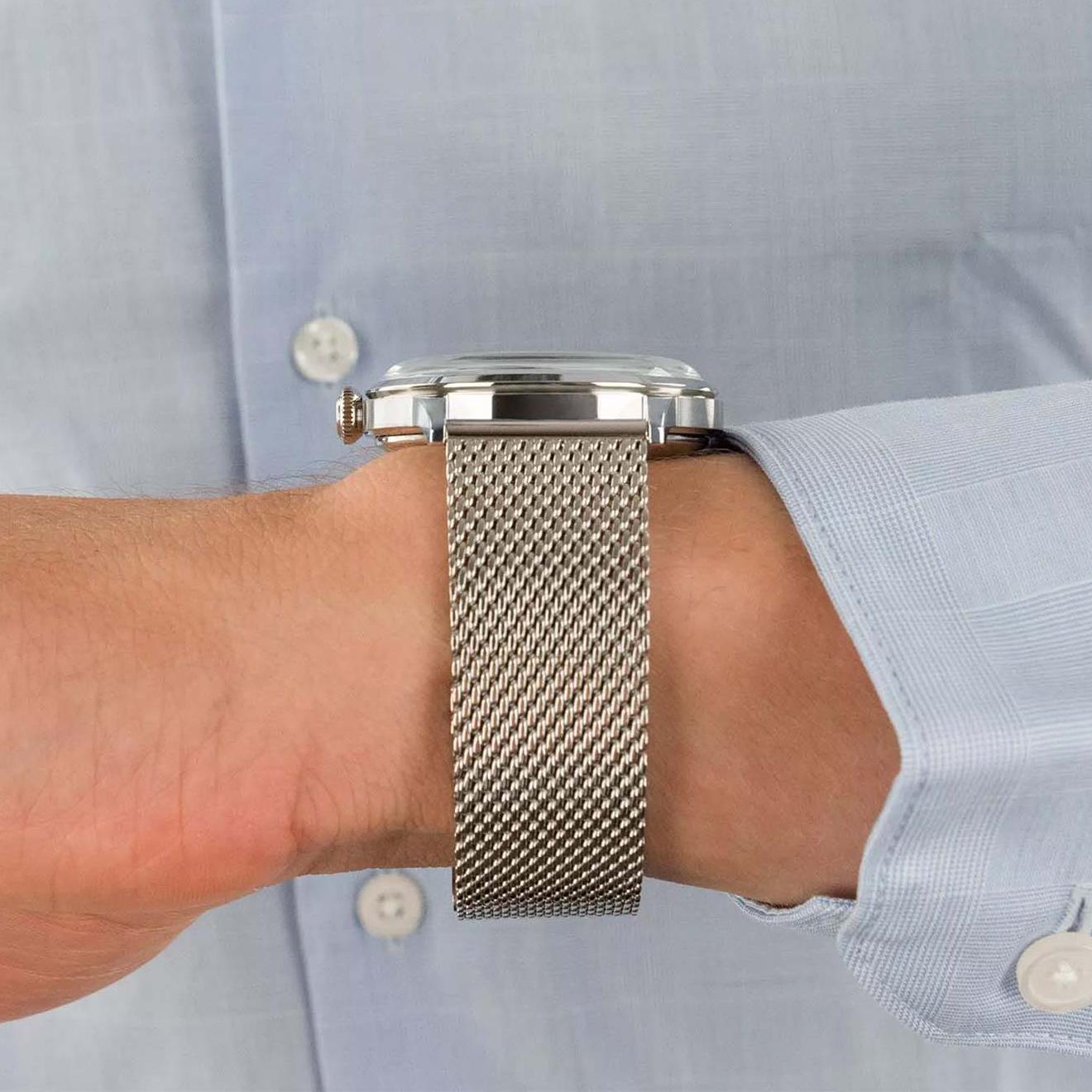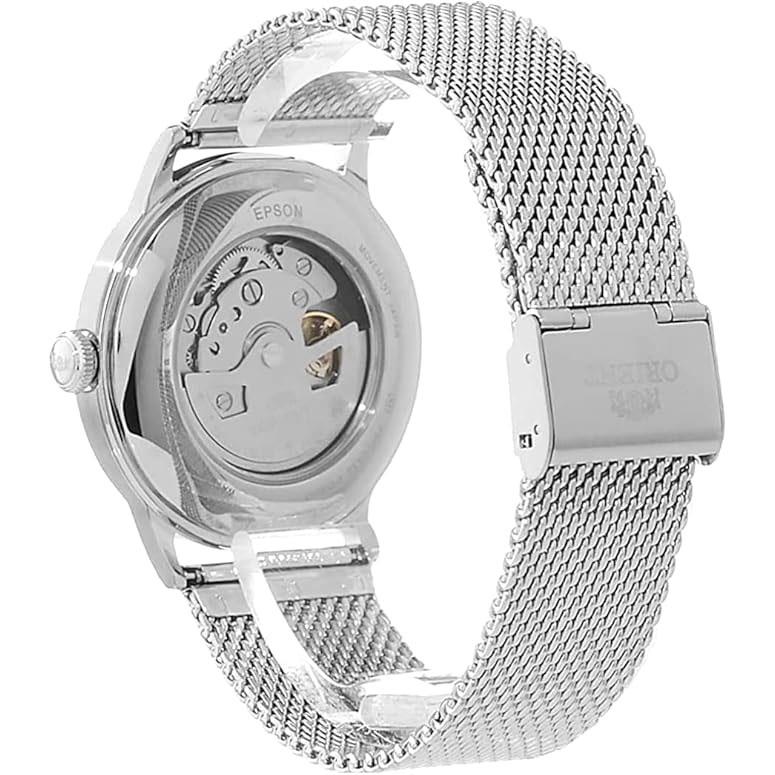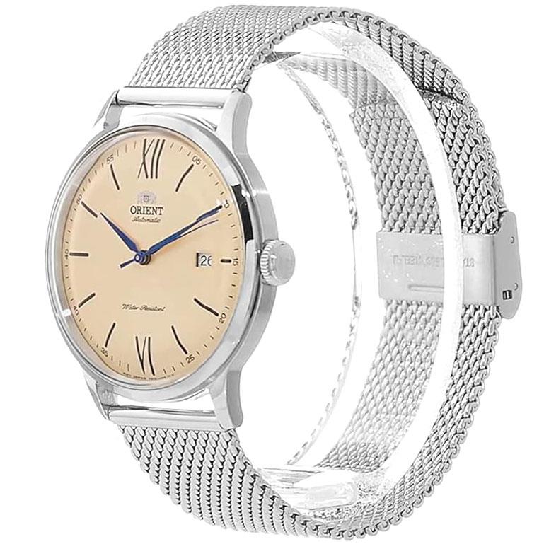 ساعت مچی مردانه اورینت orient با طراحی روزانه بند حصیربافت استیل و قاب استیل و صفحه گرد کرم با قابلیت داشتن تقویم شب نما و موتور اتوماتیک ژاپنی با انرژی مکانیکی و مقاومت در برابر آب تا عمق 30 متر به همراه گارانتی بین المللی