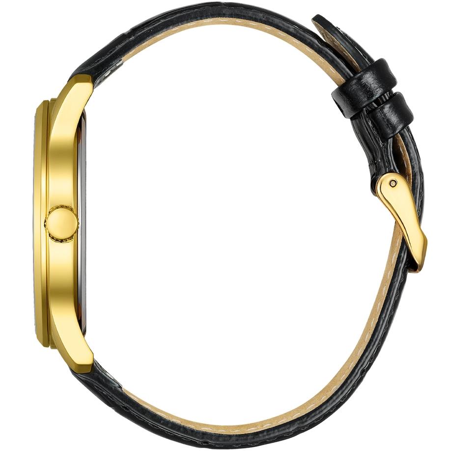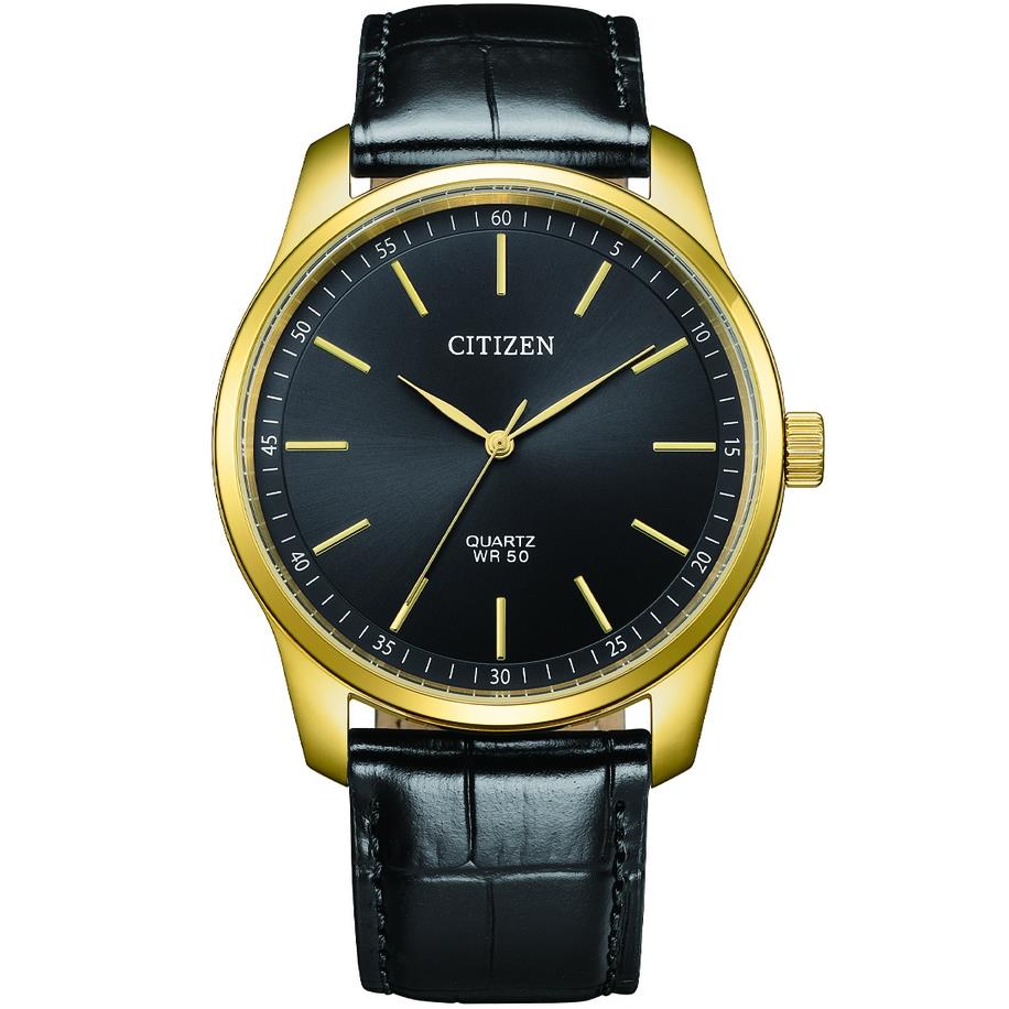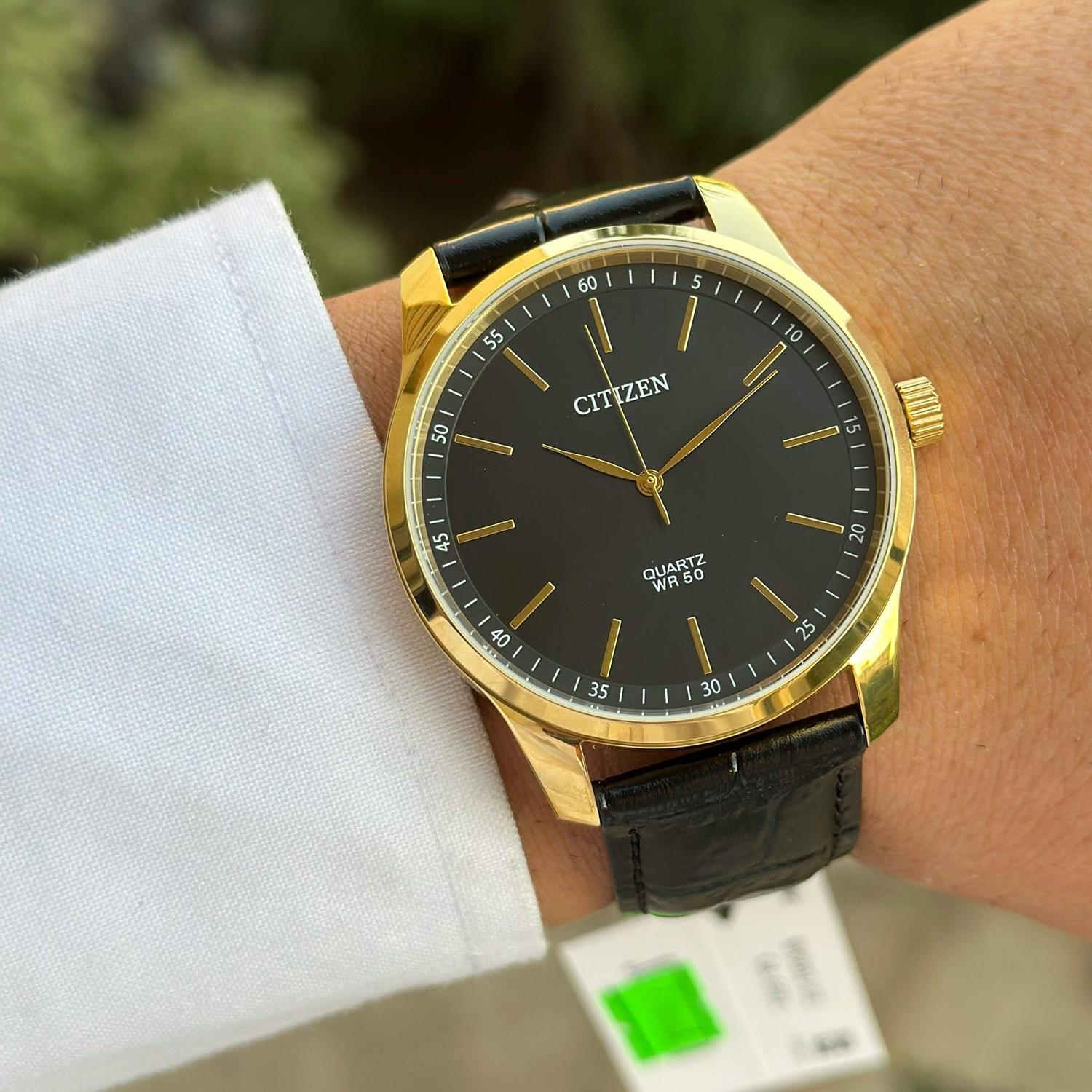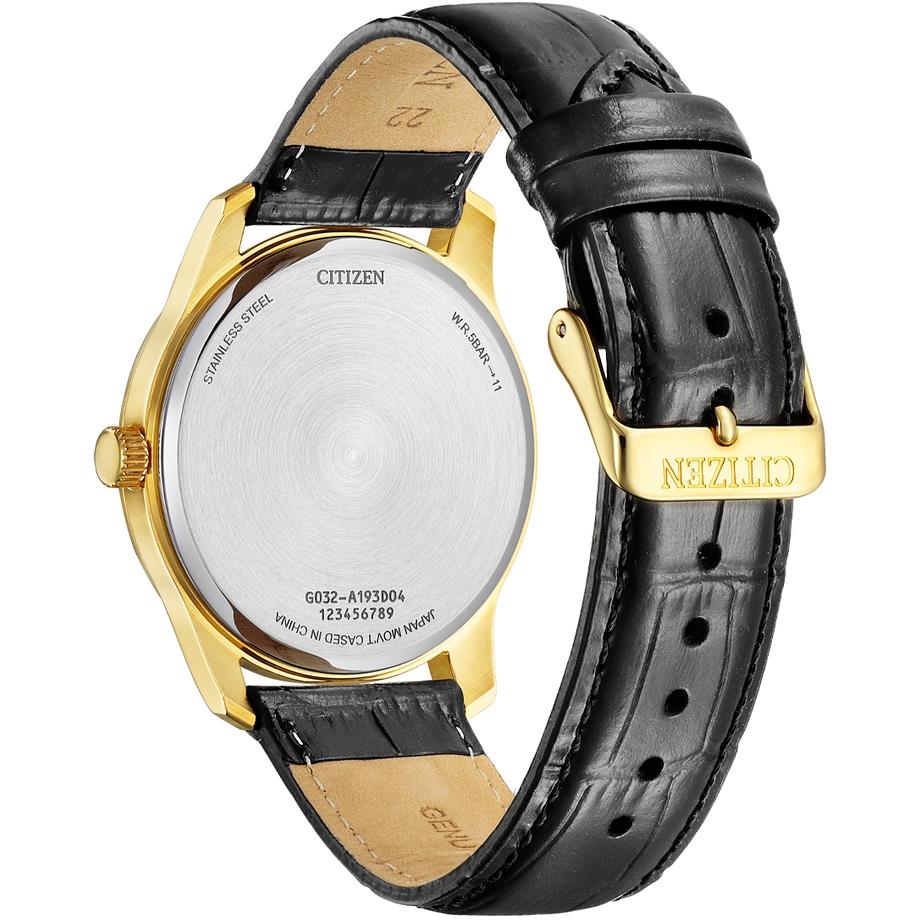ساعت مچی مردانه سیتیزن citizen با طراحی روزانه بند چرمی و قاب گرد طلایی و صفحه گرد مشکی و موتور ژاپنی با انرژی باطری و مقاومت در برابر آب تا عمق 50 متر به همراه گارانتی بین المللی