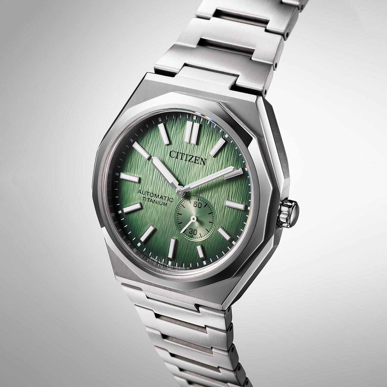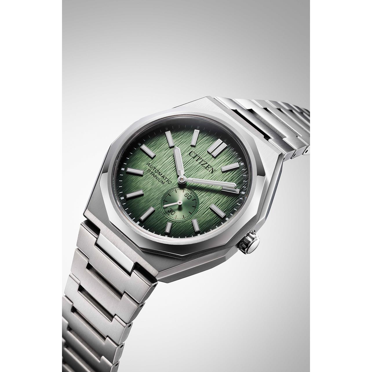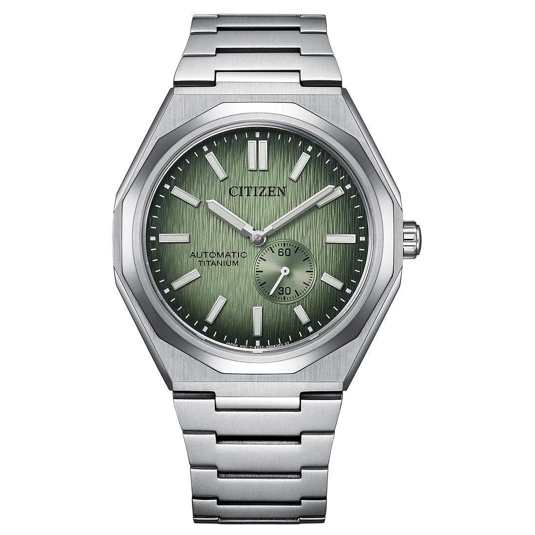 ساعت مچی مردانه سیتیزن citizen با طراحی روزانه بند تیتانیومی و قاب متفاوت تیتانیومی و صفحه گرد سبز با شیشه ضدخراش و قابلیت داشتن زیر ثانیه/ شبنما و موتوراتوماتیک ژاپنی با انرژی مکانیکی و مقاومت در برابر آب تا عمق 100 متر به همراه گارانتی بین المللی