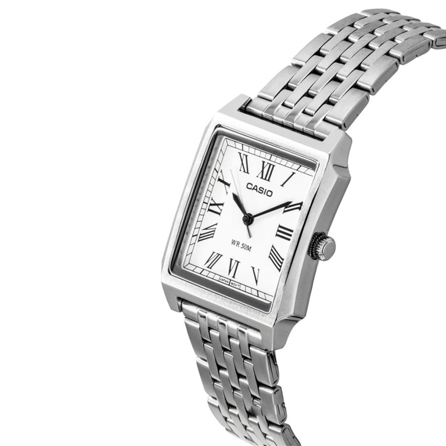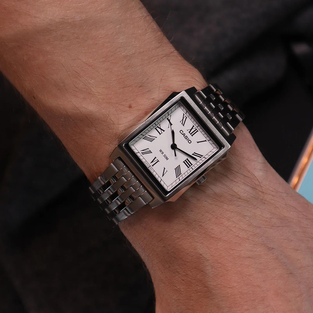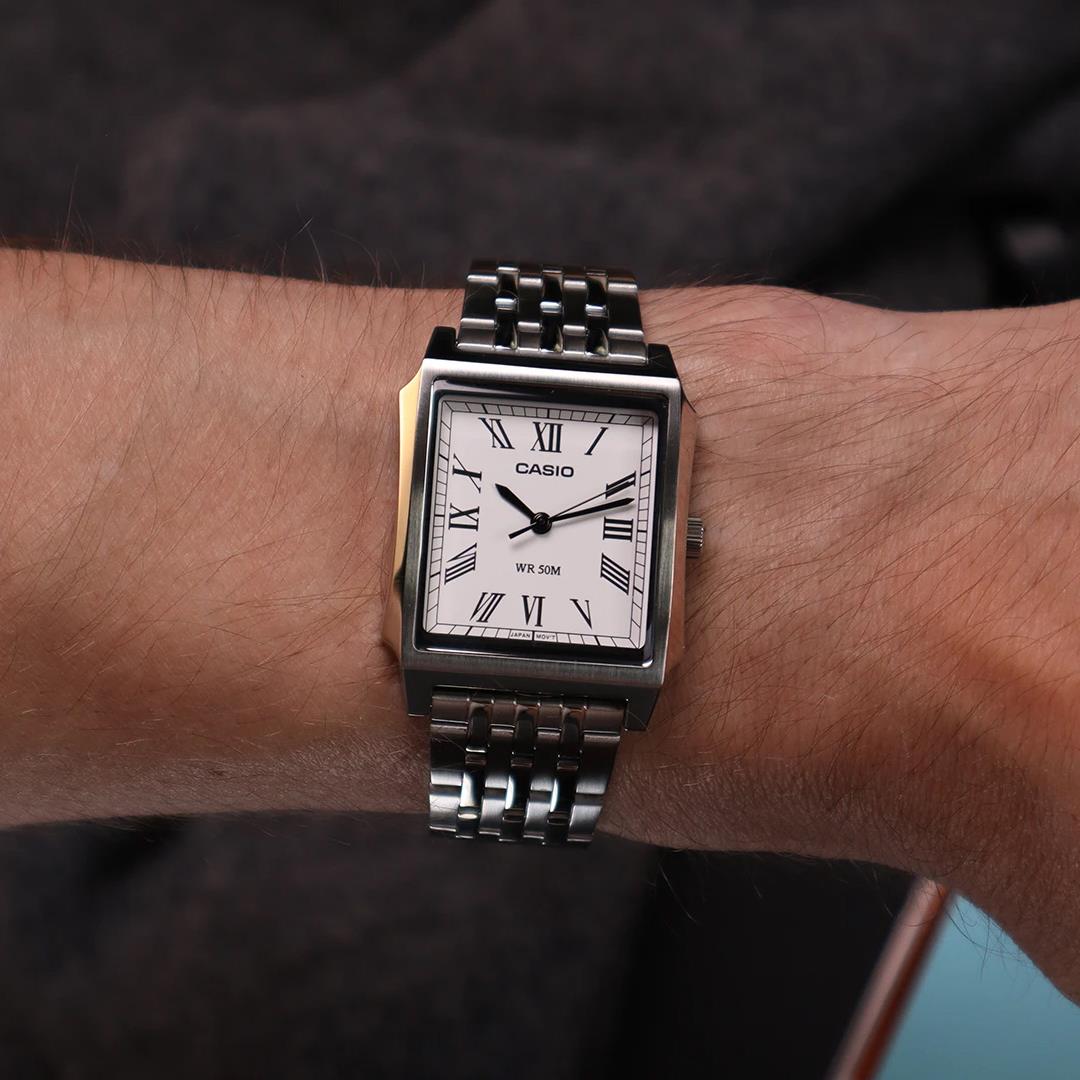 ساعت مچی مردانه کاسیو Casio با طراحی روزانه بند استیل و قاب مستطیلی استیل و صفحه دو رنگ با قابلیت داشتن تقویم روزهای هفته روز و شب و موتور ژاپنی با انرژی باتری و مقاوم در برابر آب تا عمق 50 متر به همراه گارانتی بین المللی