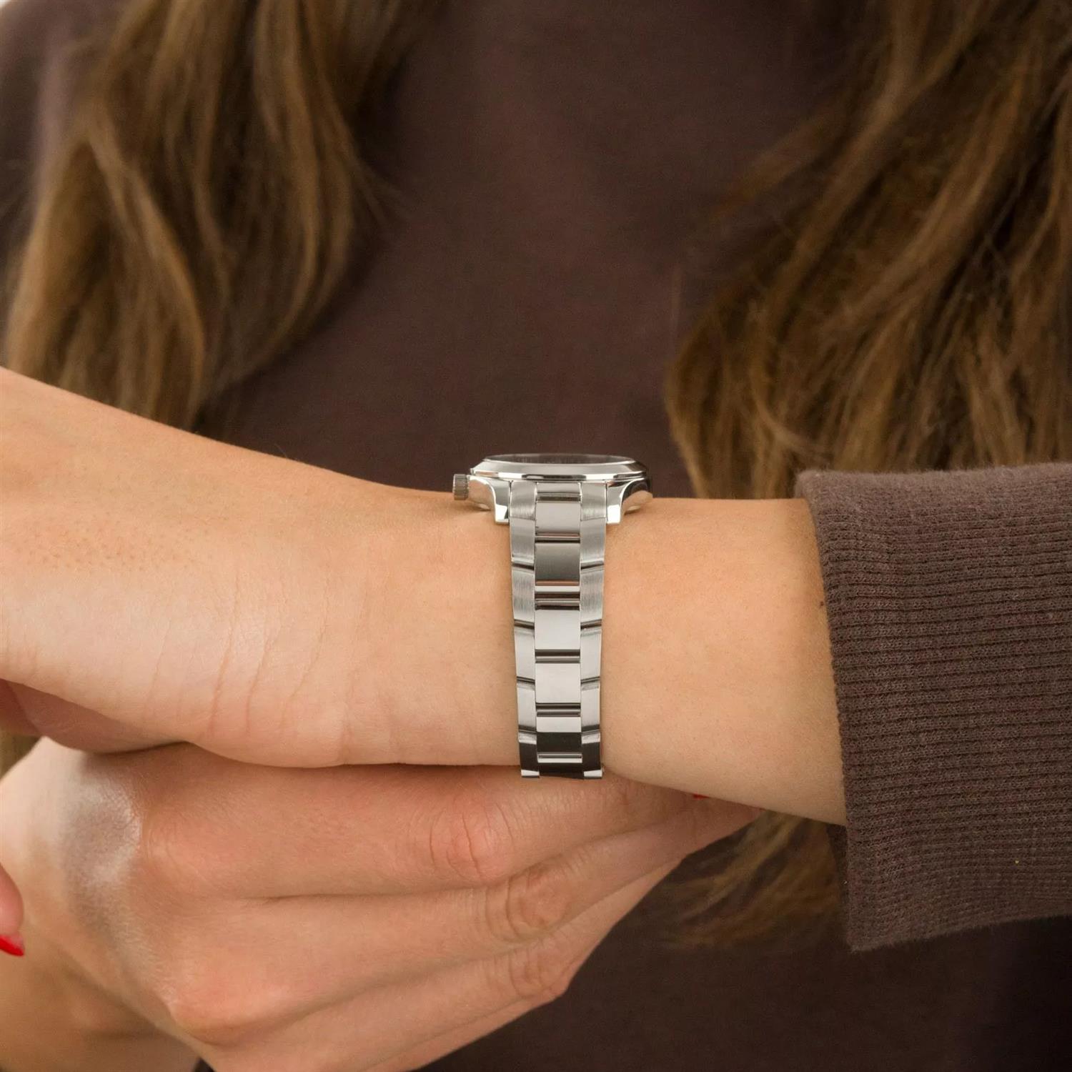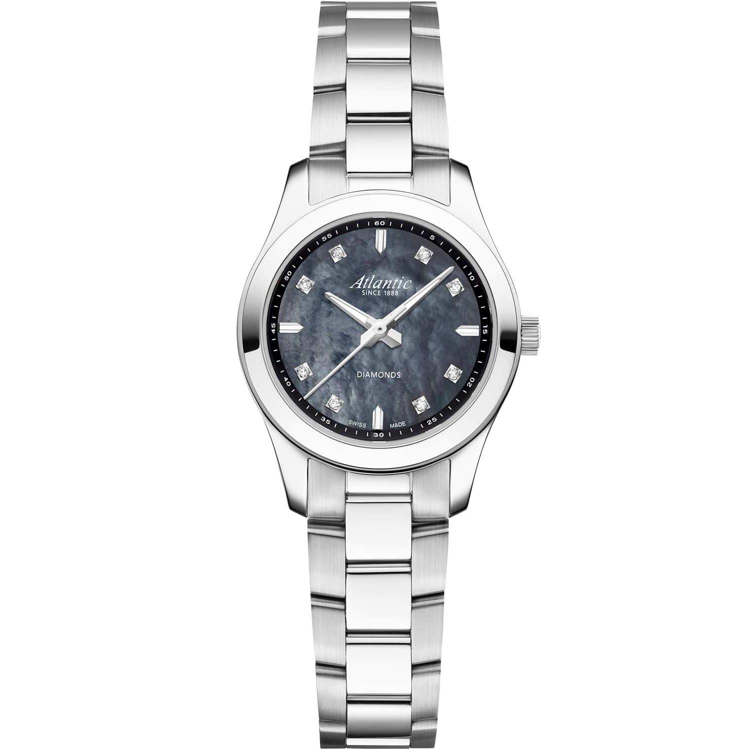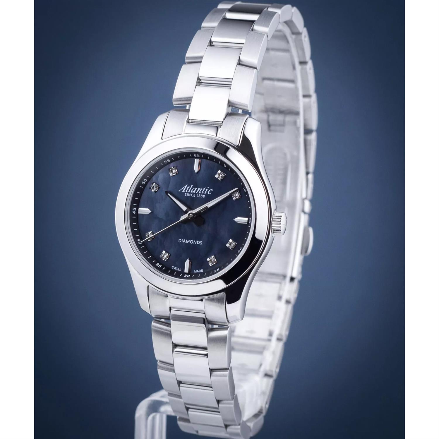 ساعت مچی زنانه آتلانتیک Atlantic با طراحی ساده بند استیل و قاب گرد استیل  و صفحه نگین دار سرمه ای صدفی با شیشه ضد خراش و موتور سویسی با انرژی باتری و مقاوم در برابر آب تا عمق 30 متر به همراه گارانتی بین المللی