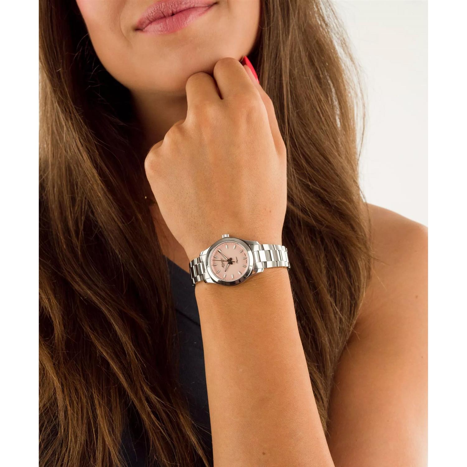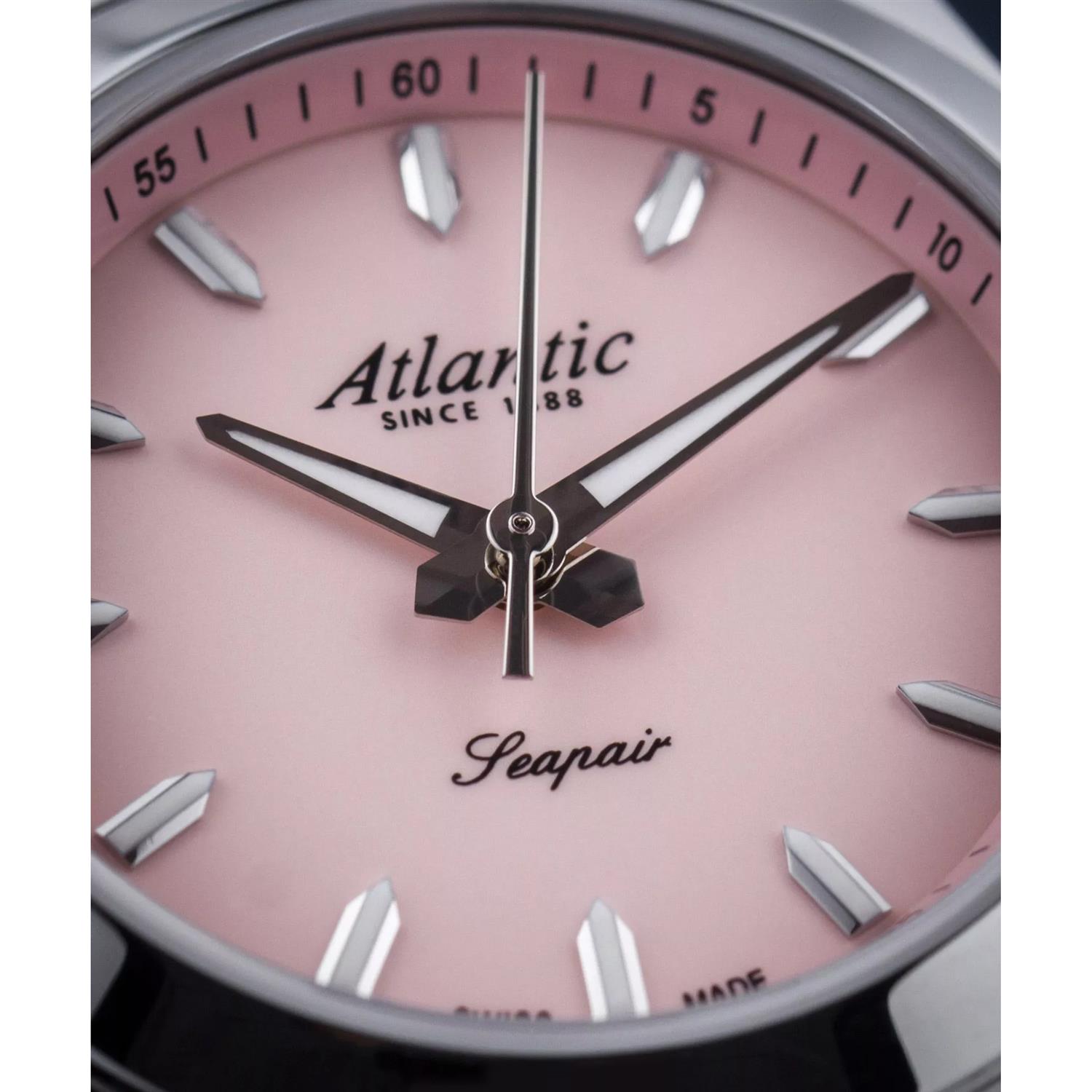 ساعت مچی زنانه آتلانتیک Atlantic با طراحی ساده بند استیل و قاب گرد استیل  و صفحه صورتی با شیشه ضد خراش وقابلیت داشتن شب نما و موتور سویسی با انرژی باتری و مقاوم در برابر آب تا عمق 30 متر به همراه گارانتی بین المللی