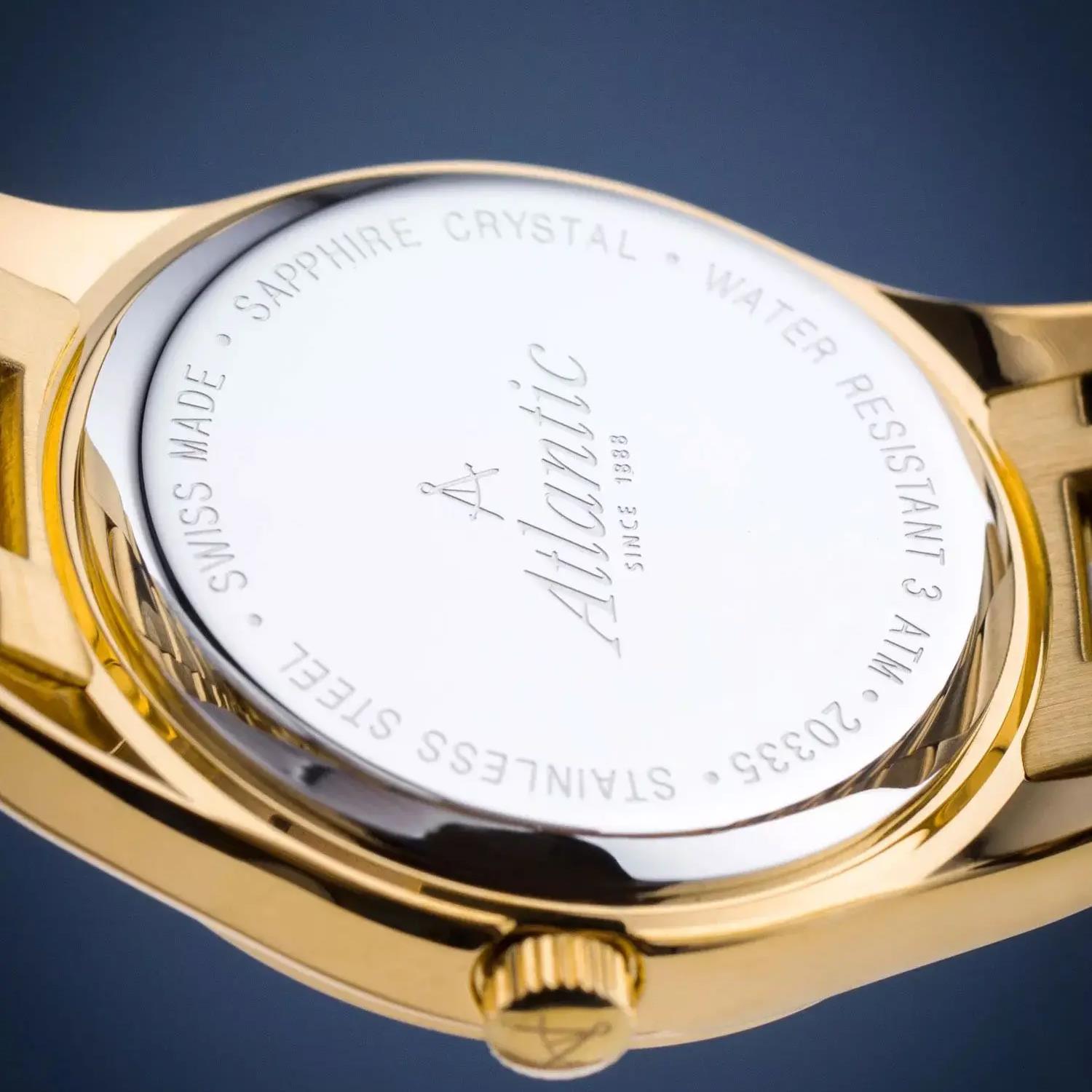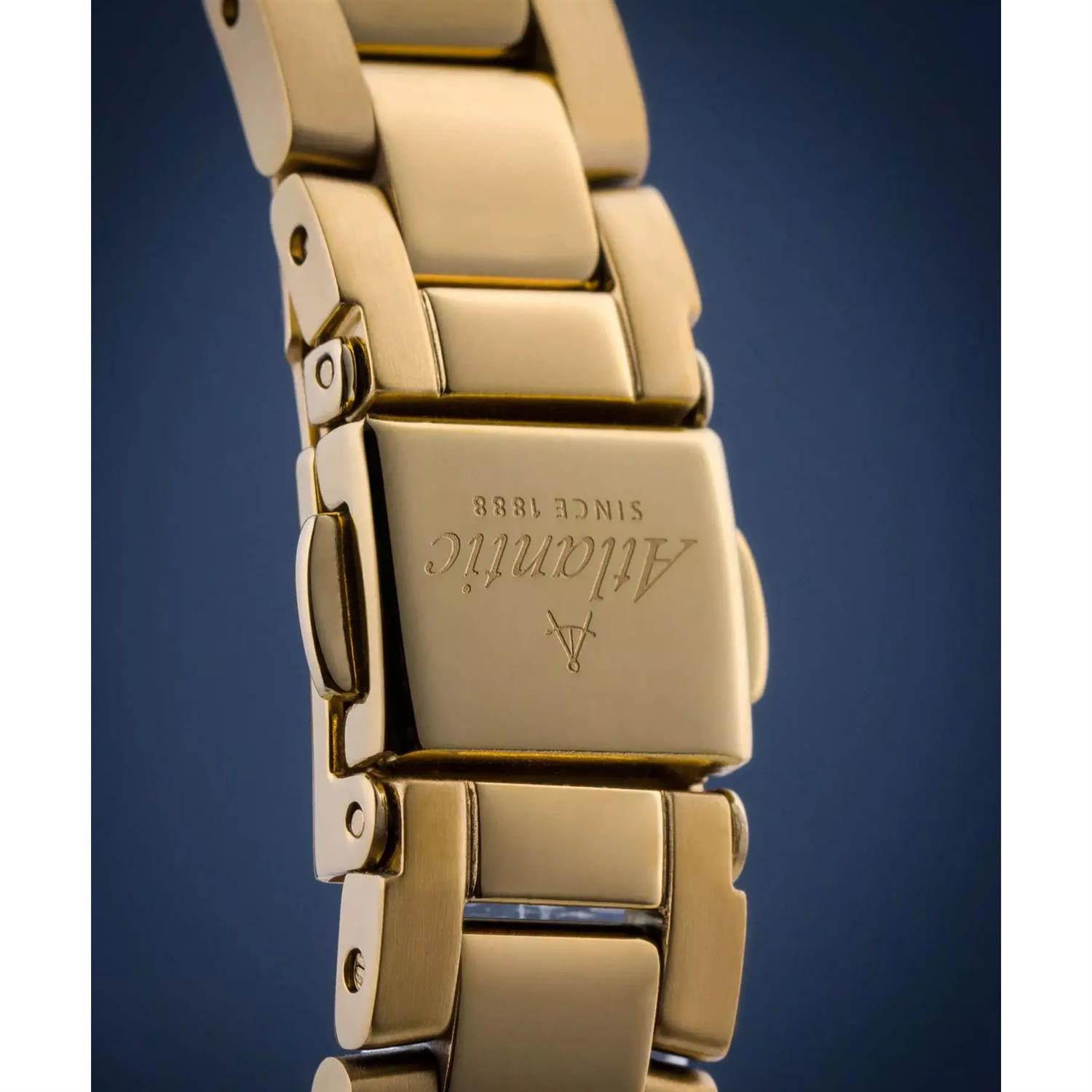 ساعت مچی زنانه آتلانتیک Atlantic با طراحی ساده بند فلزی طلایی قاب گرد طلایی وصفحه سرمه ای با شیشه ضد خراش وقابلیت داشتن شب نما و موتور سویسی با انرژی باتری و مقاوم در برابر آب تا عمق 30 متر به همراه گارانتی بین المللی