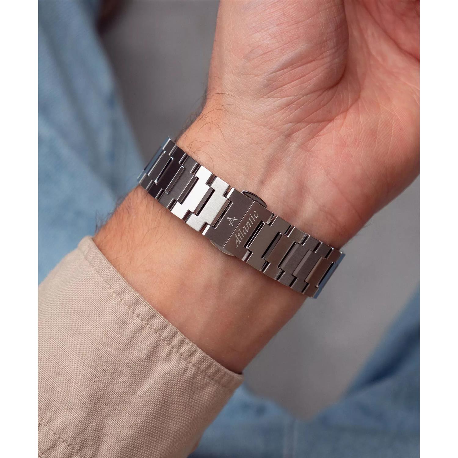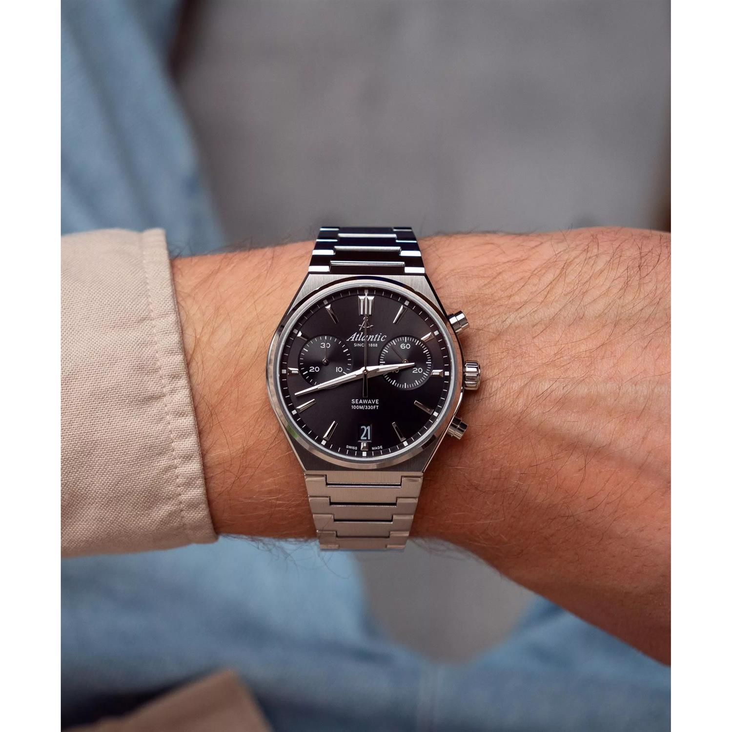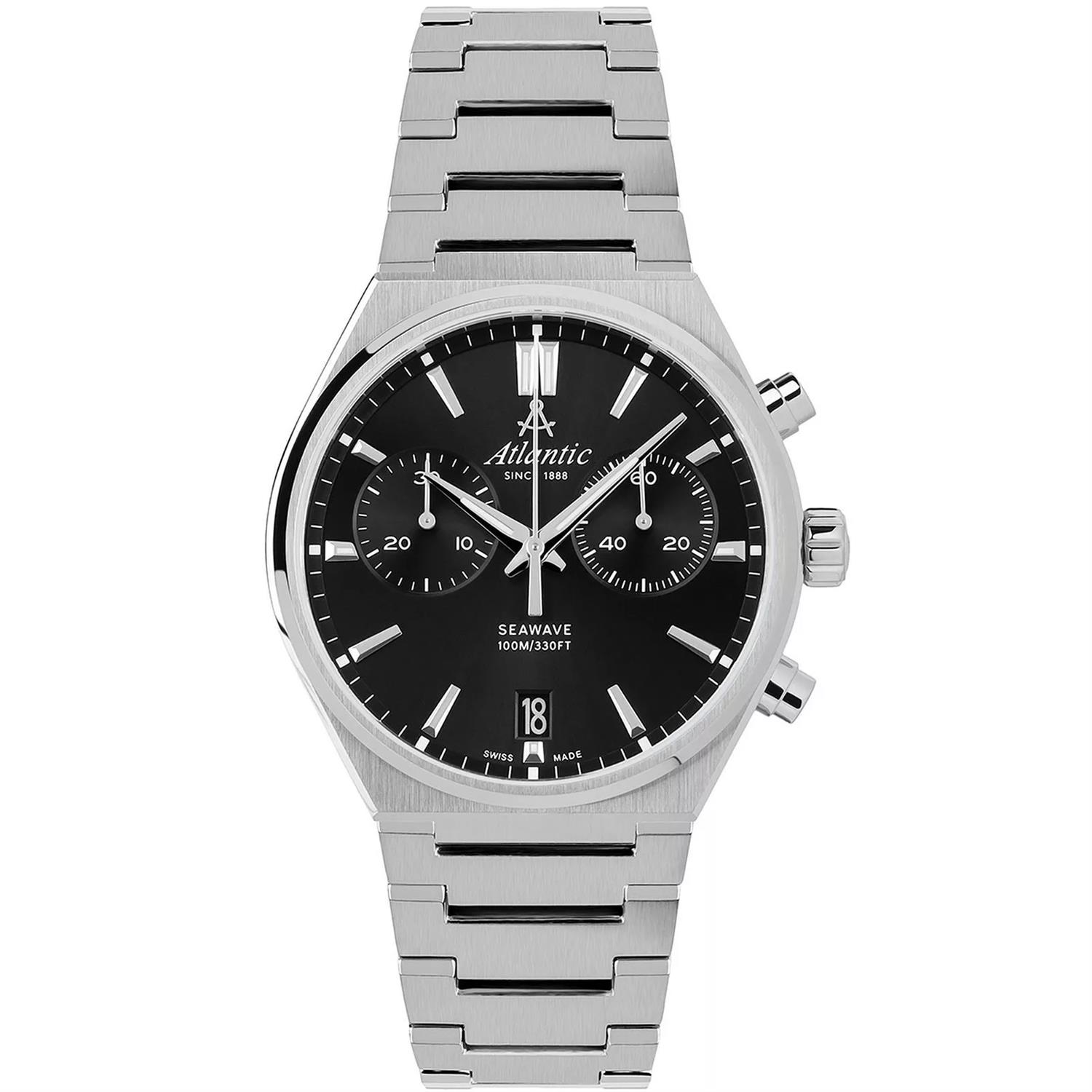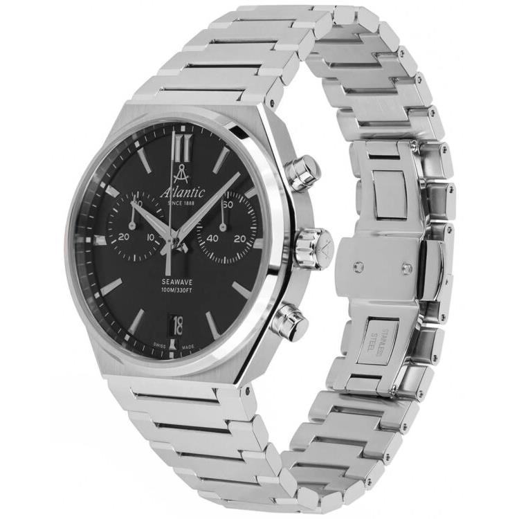 ساعت مچی مردانه آتلانتیک ATLANTIC با طراحی روزانه بند استیل با قاب استیل و صفحه مشکی با قابلیت داشتن تقویم, شب نما کرنوگراف و شیشه ضد خراش, موتور سوییسی با انرژی باطری و مقاوم در برابر آب تا عمق 100 متر به همراه دو سال گارانتی بین المللی