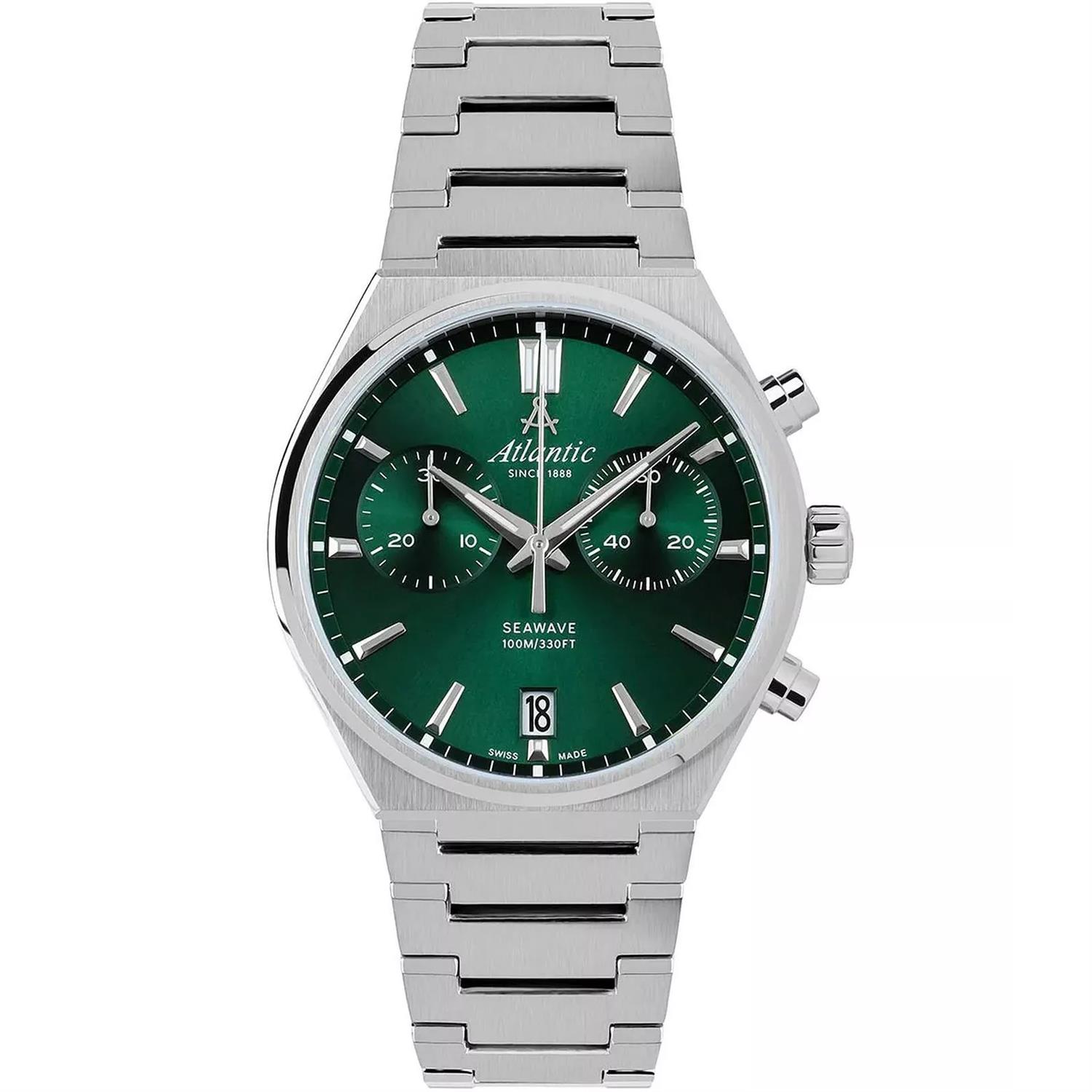 ساعت مچی مردانه آتلانتیک ATLANTIC با طراحی روزانه بند استیل با قاب استیل و صفحه سبز با قابلیت داشتن تقویم, شب نما کرنوگراف و شیشه ضد خراش, موتور سوییسی با انرژی باطری و مقاوم در برابر آب تا عمق 100 متر به همراه دو سال گارانتی بین المللی
