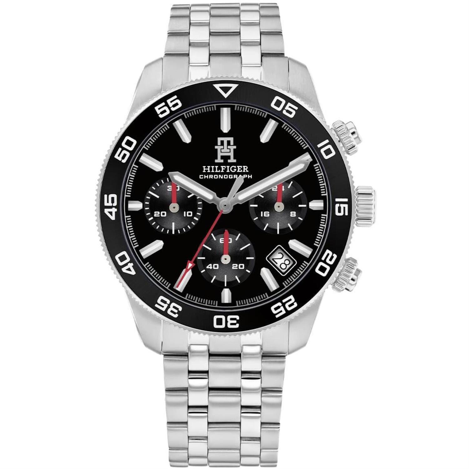 ساعت مچی مردانه تامی هیلفیگرTommy Hilfiger با طراحی روزانه بند استیل و قاب گرد استیل مشکی و صفحه مشکی با قابلیت داشتن تقویم / زه چرخان / کرنوگراف / شب نما و موتور ژاپنی با انرژی باتری و مقاوم در برابر آب تا عمق 50 متر به همراه گارانتی بین المللی