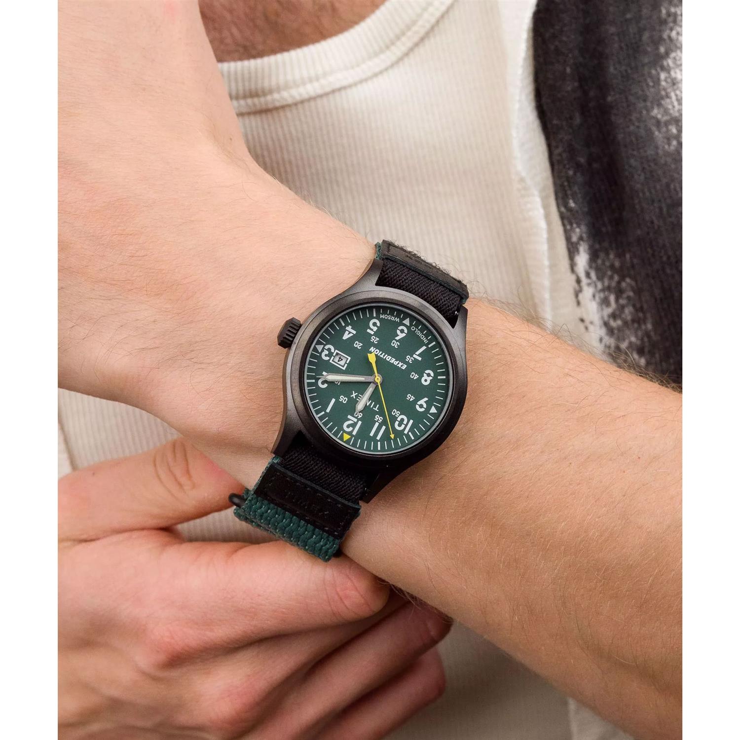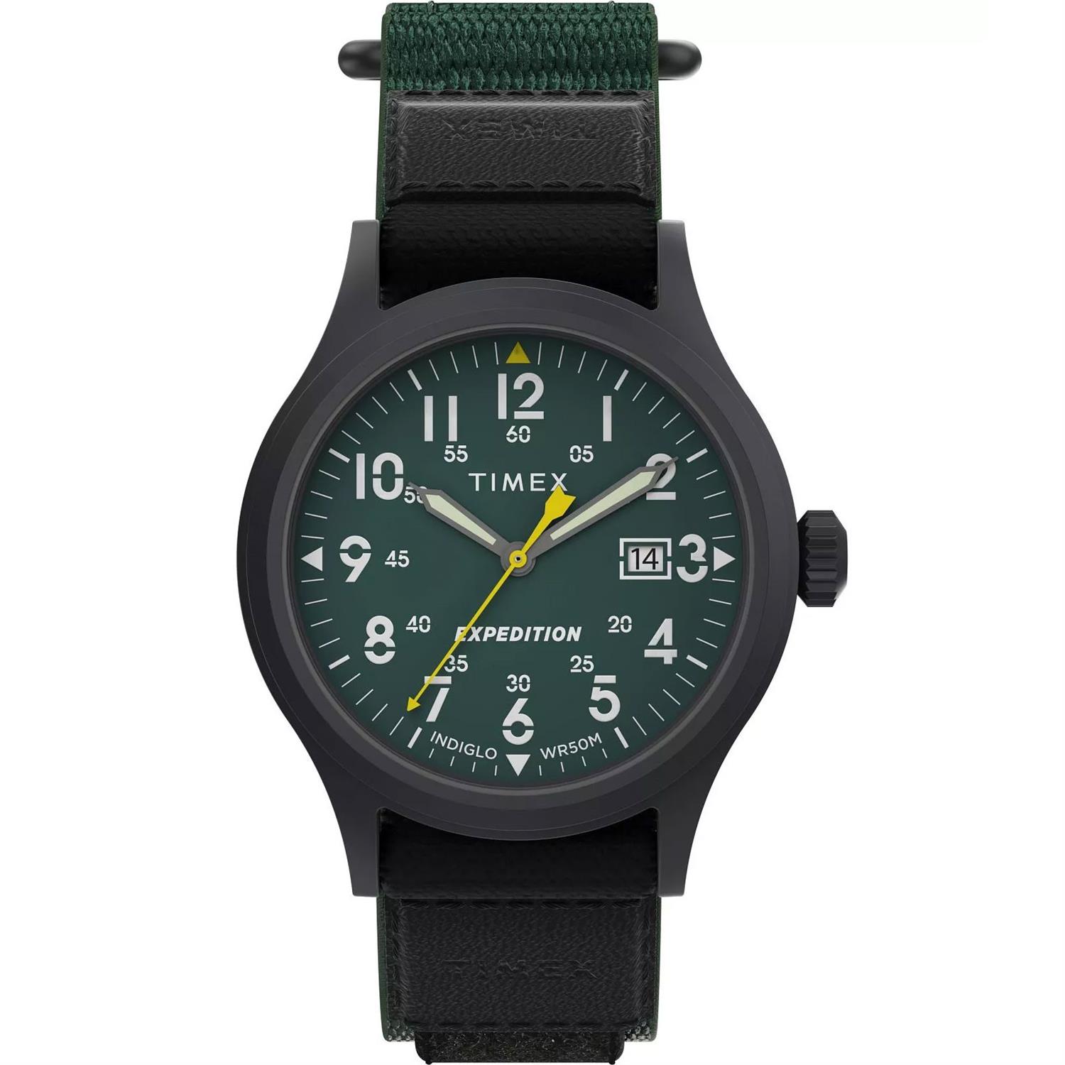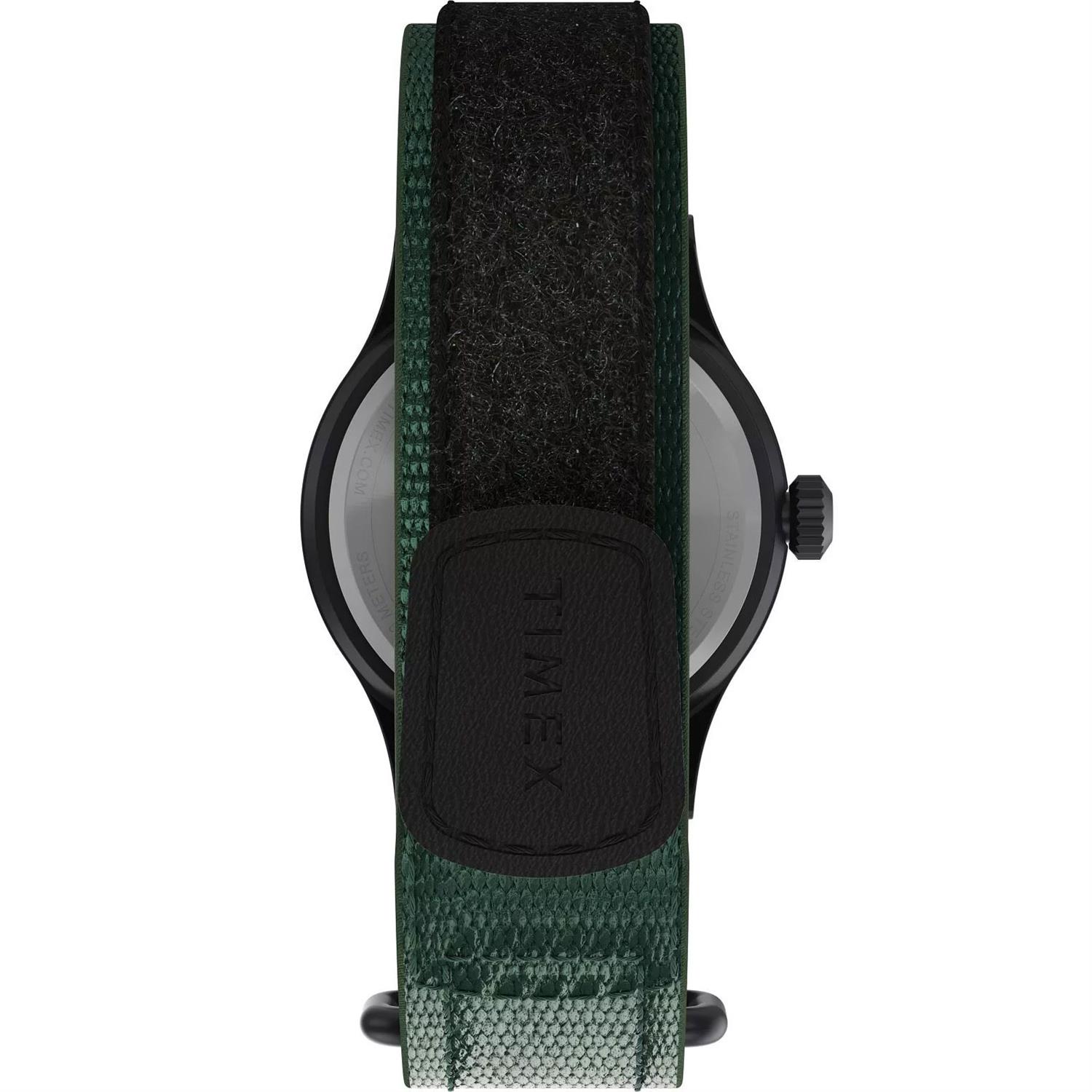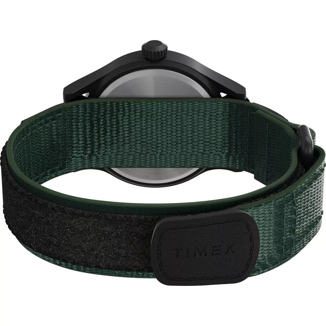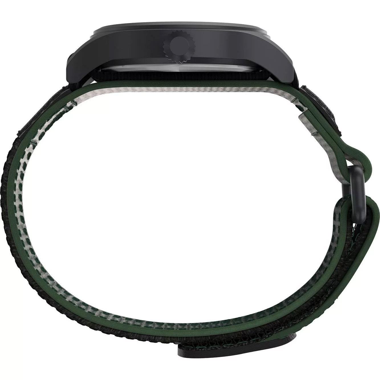 ساعت مچی مردانه تایمکس timex با طراحی اسپرت بند برزنتی سبز و قاب مشکی با صفحه سبز و قابلیت داشتن شب نما / تقویم و موتور ژاپنی با انرژی باطری و مقاوم در برابر آب تا عمق 50 متر به همراه گارانتی بین المللی