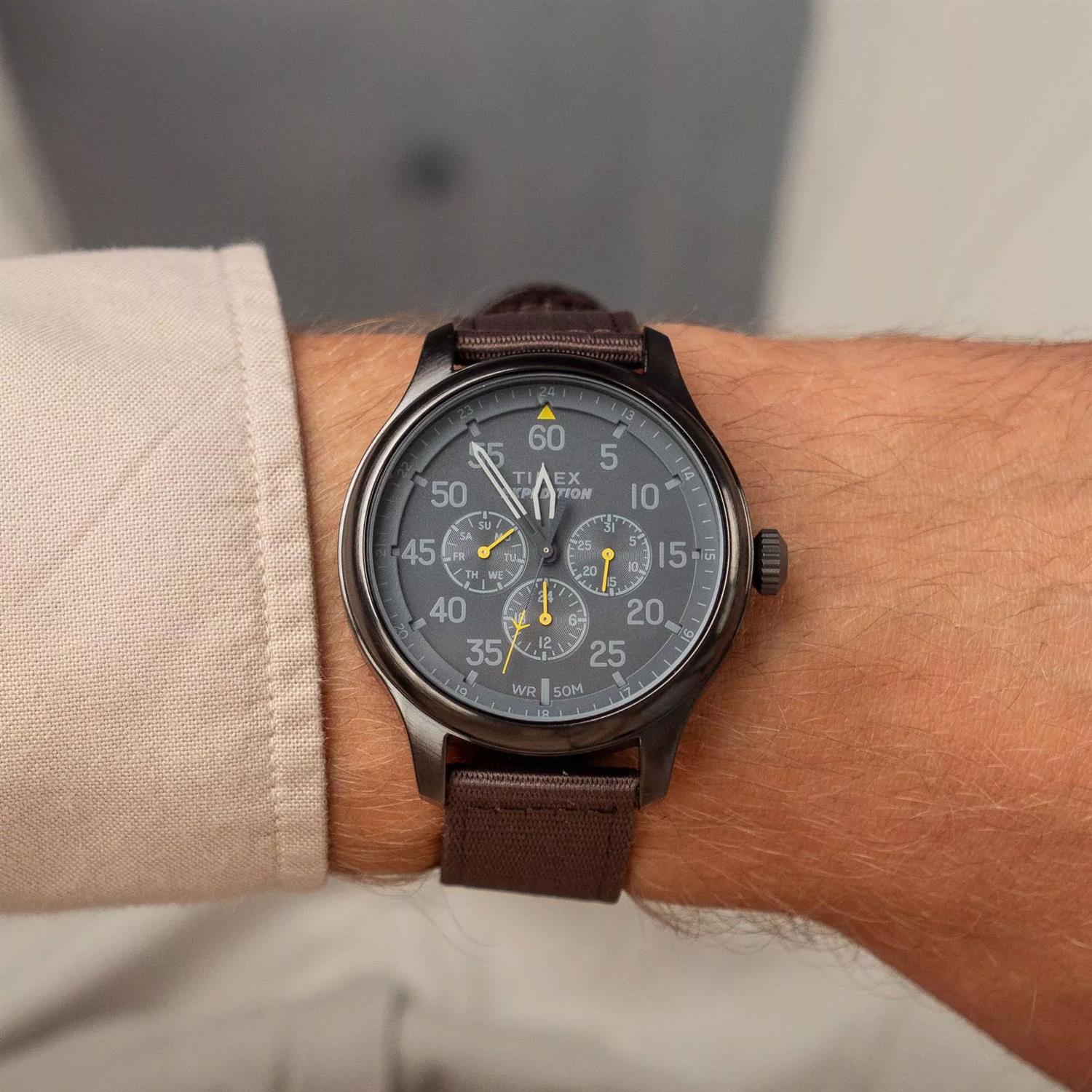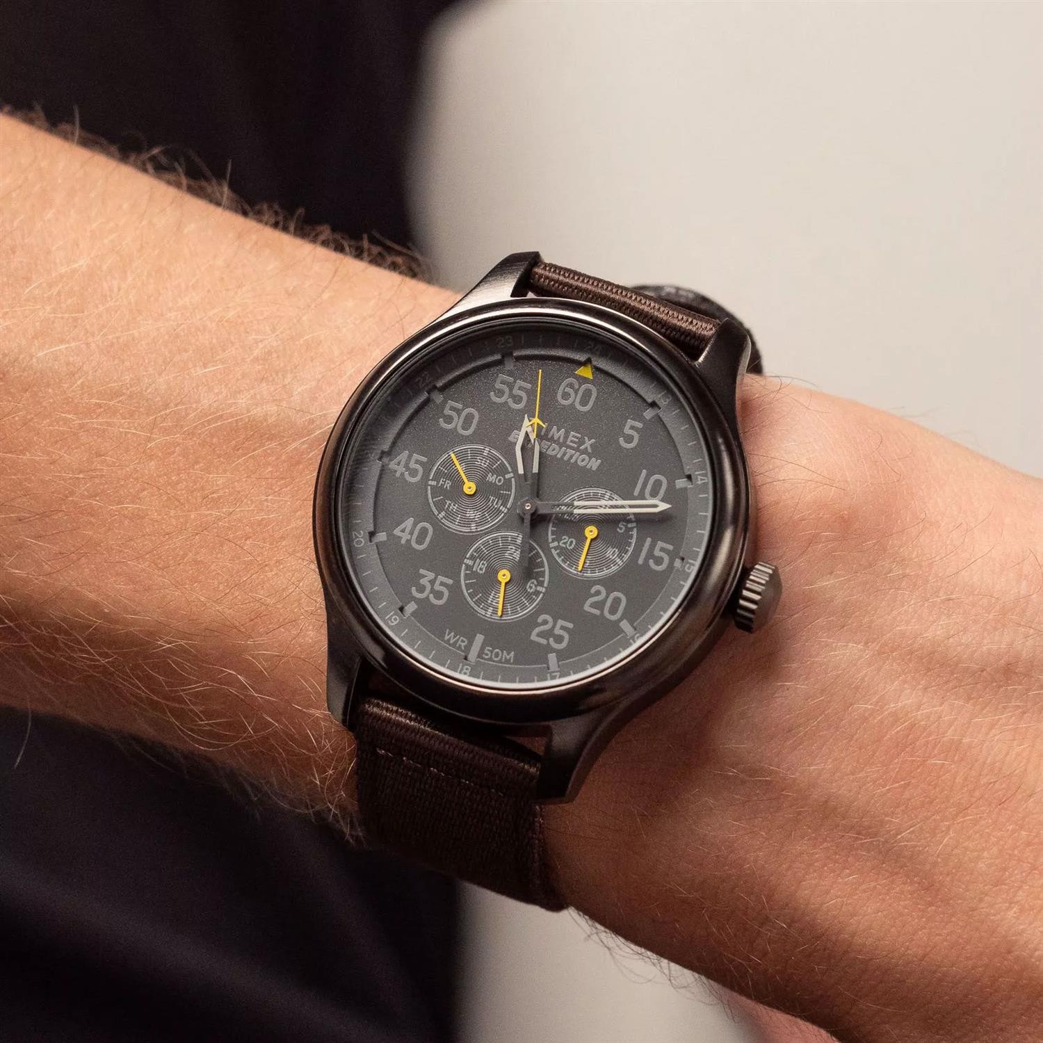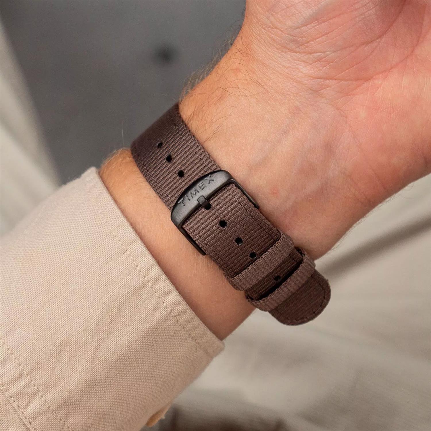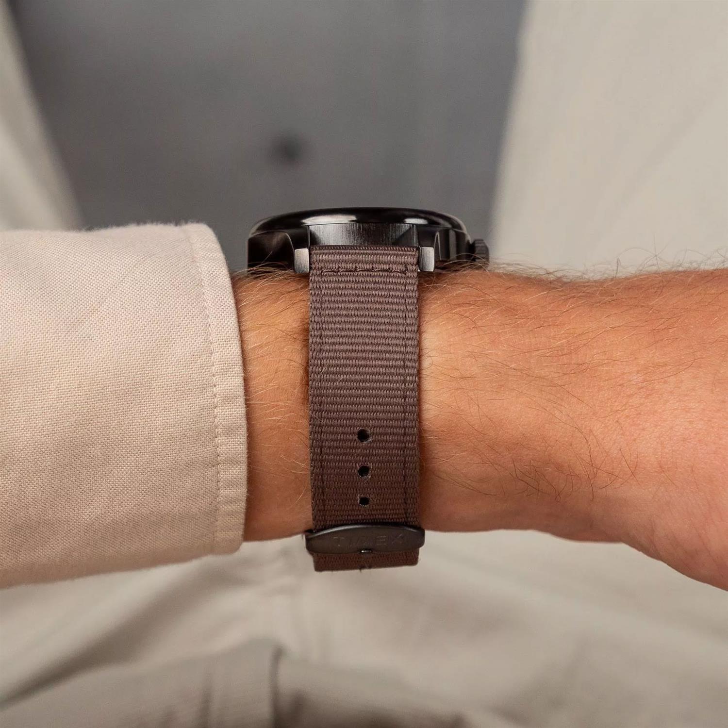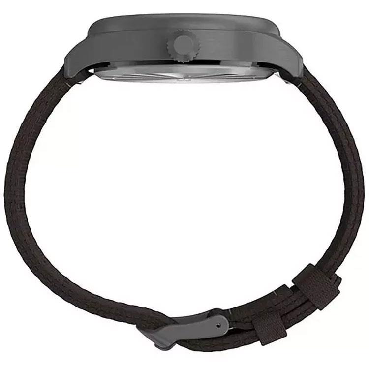 ساعت مچی مردانه تایمکس timex با طراحی اسپرت بند برزنتی قهوه ای و قاب طوسی با صفحه طوسی و قابلیت داشتن شب نما / تقویم / روزوشب / روزهای هفته و موتور ژاپنی با انرژی باطری و مقاوم در برابر آب تا عمق 50متر به همراه گارانتی بین المللی
