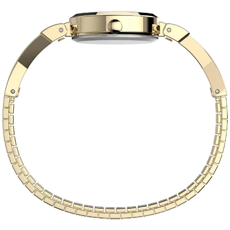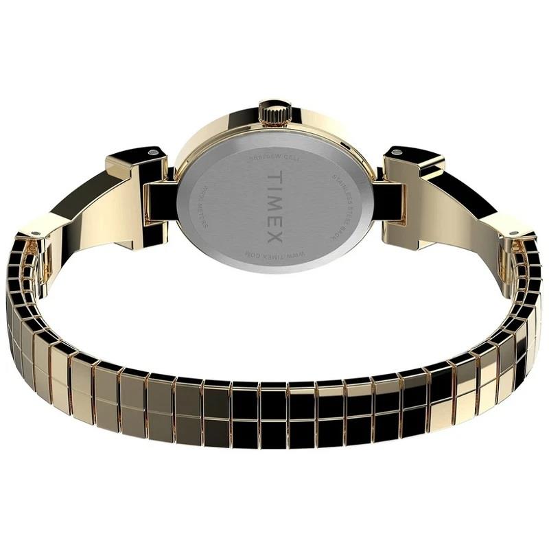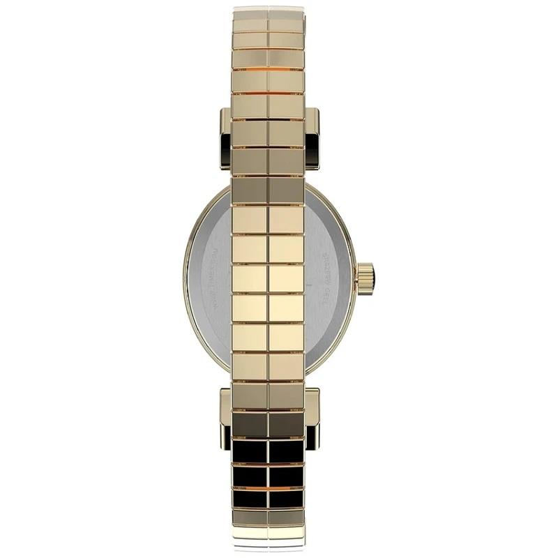 ساعت مچی زنانه تایمکس timex با طراحی کلاسیک بند فلزی طلایی و قاب بیضی نگین دار با صفحه سفید صدفی و موتور ژاپنی با انرژی باطری و مقاوم در برابر آب تا عمق 30 متر به همراه گارانتی بین المللی
