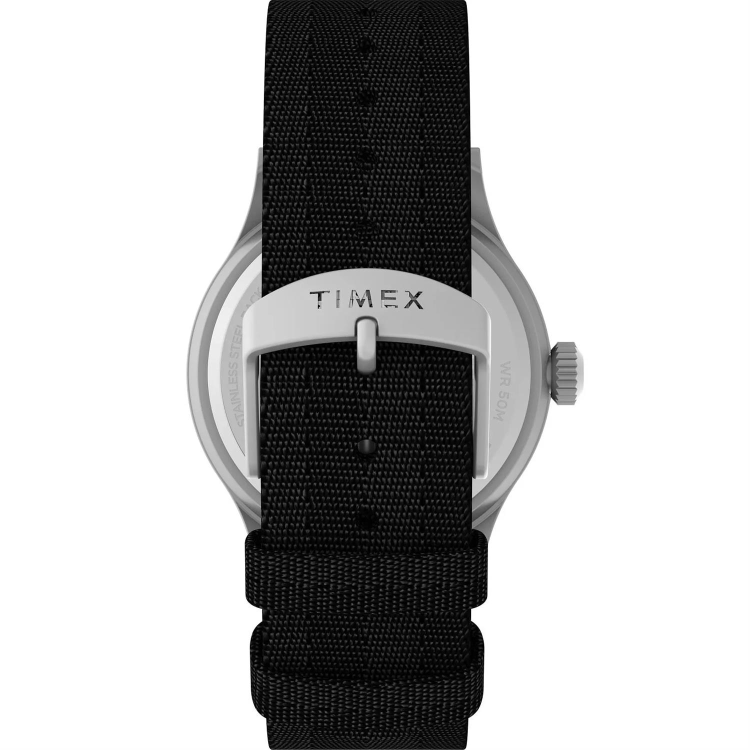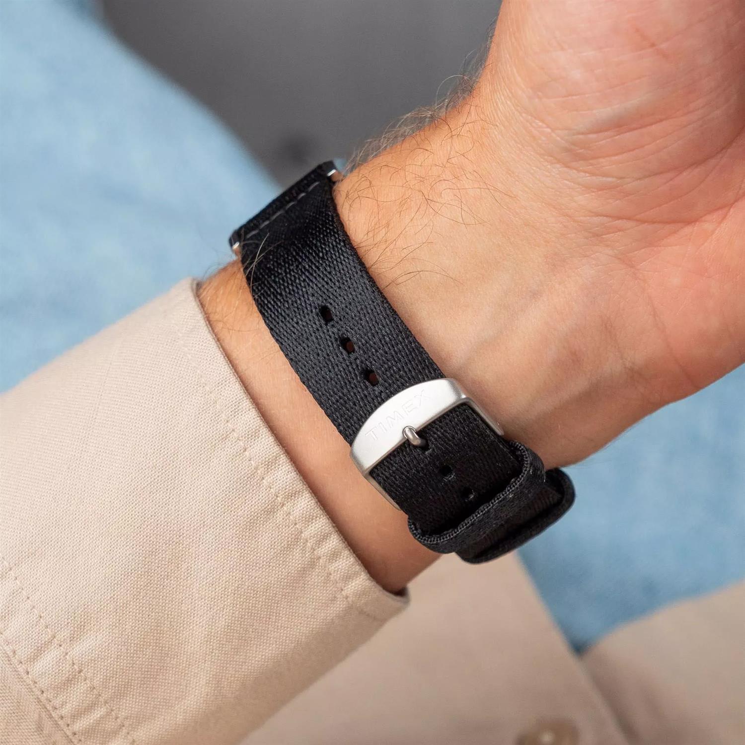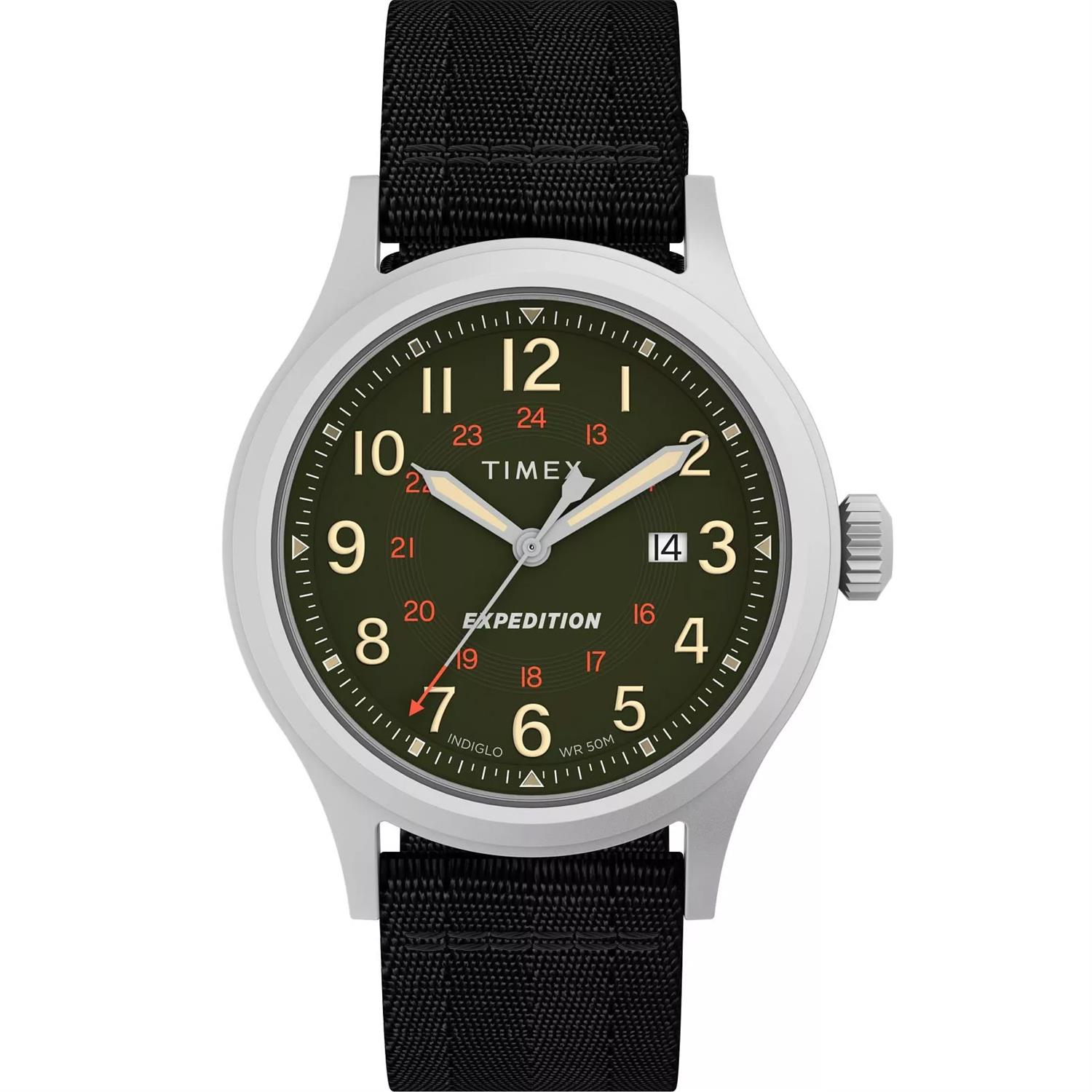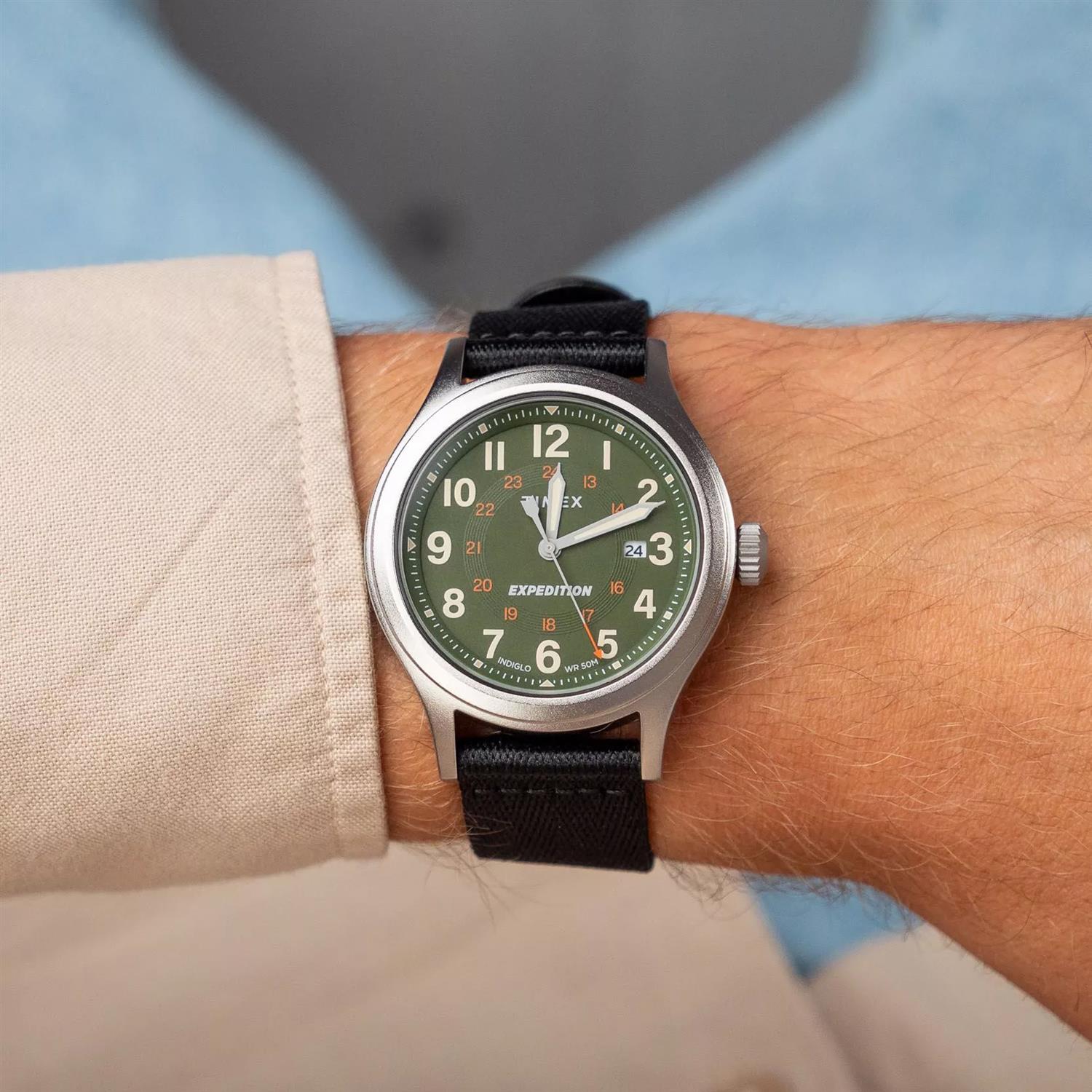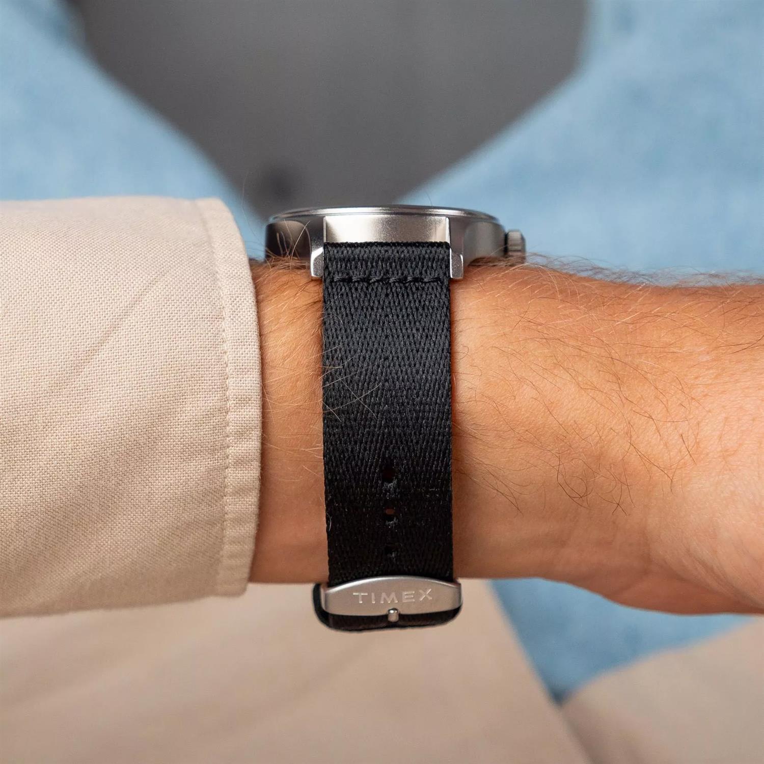 ساعت مچی مردانه تایمکس timex با طراحی اسپرت بند برزنتی مشکی و قاب نقره ای با صفحه سبز و قابلیت داشتن شب نما / تقویم و موتور ژاپنی با انرژی باطری و مقاوم در برابر آب تا عمق 50 متر به همراه گارانتی بین المللی