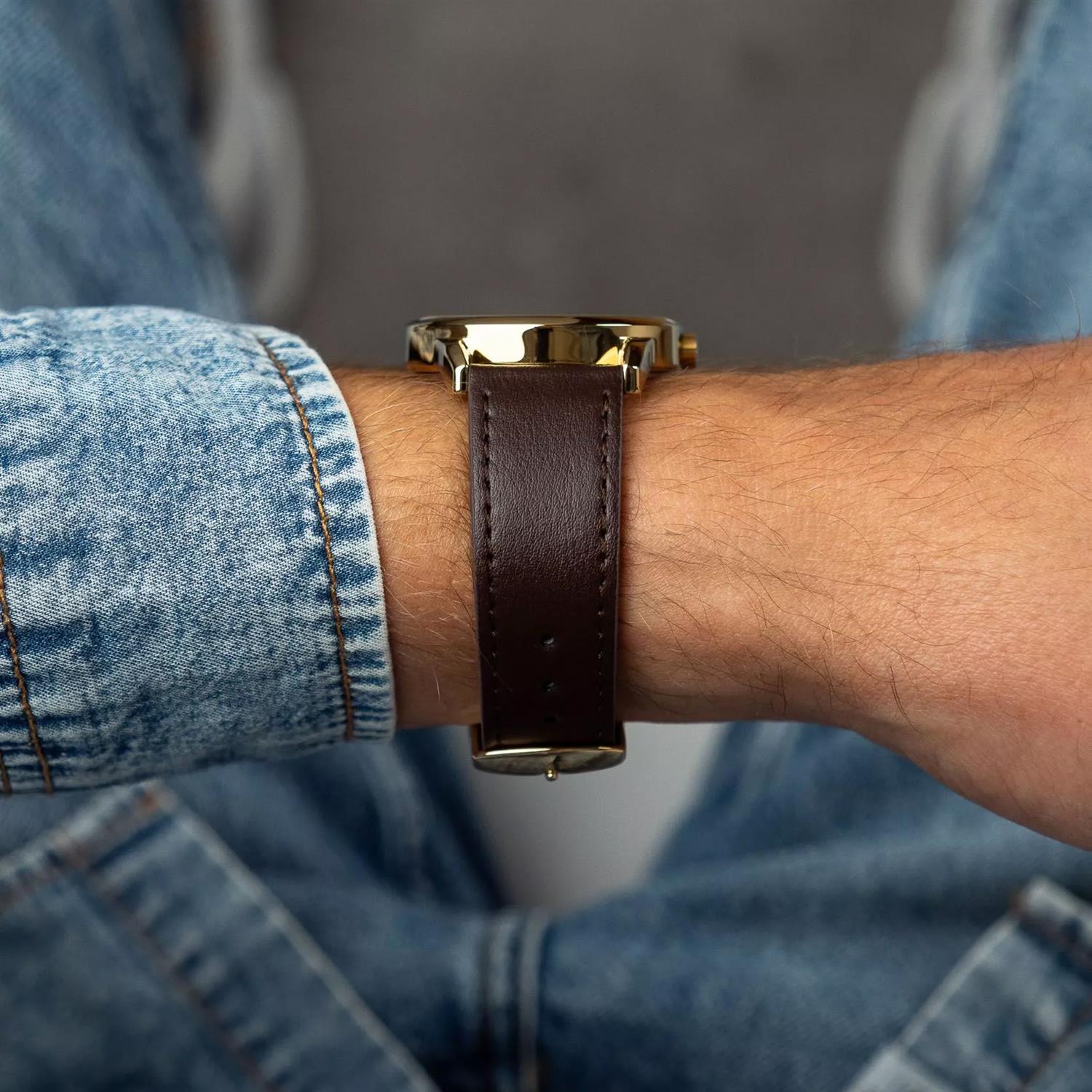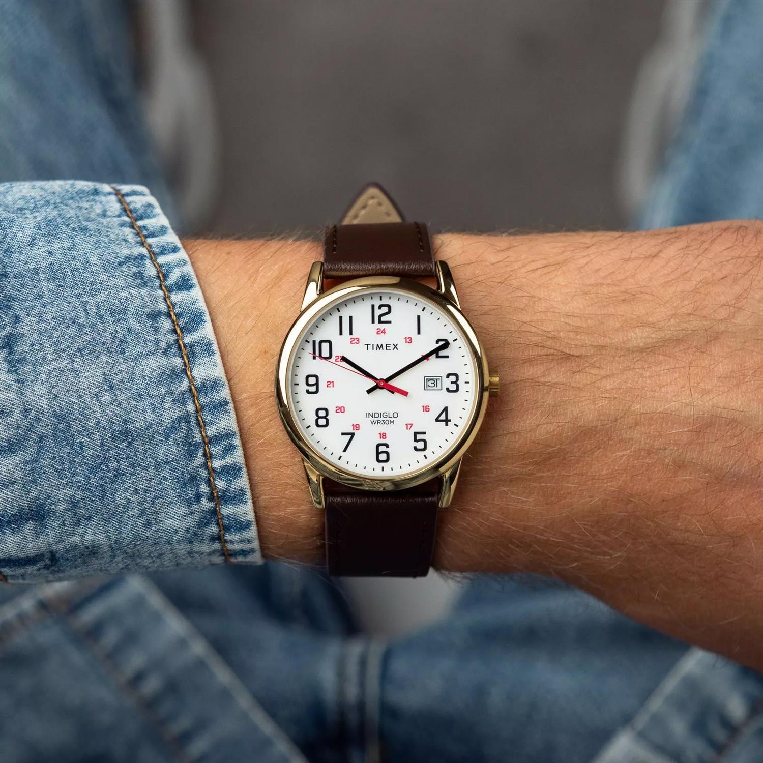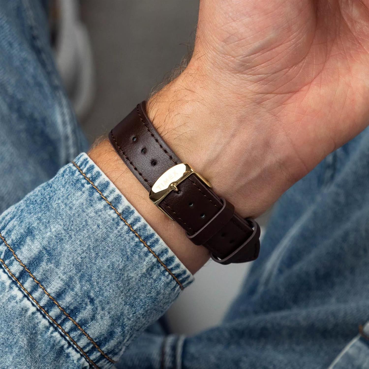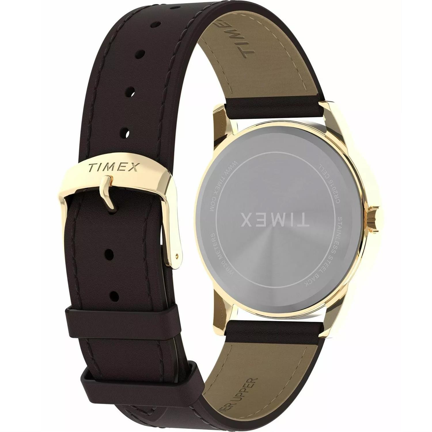 ساعت مچی مردانه تایمکس timex با طراحی اسپرت بند چرم قهوه ای و قاب گرد طلایی با صفحه سفید و قابلیت داشتن تقویم/ نور پشت صفحه و موتور ژاپنی با انرژی باطری و مقاوم در برابر آب تا عمق 30 متر به همراه گارانتی بین المللی
