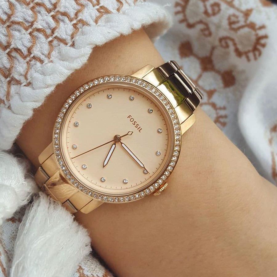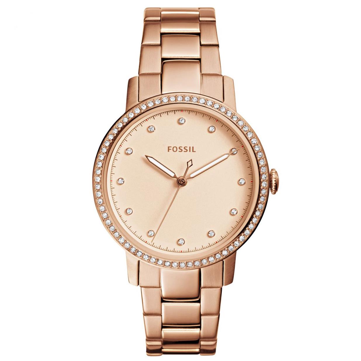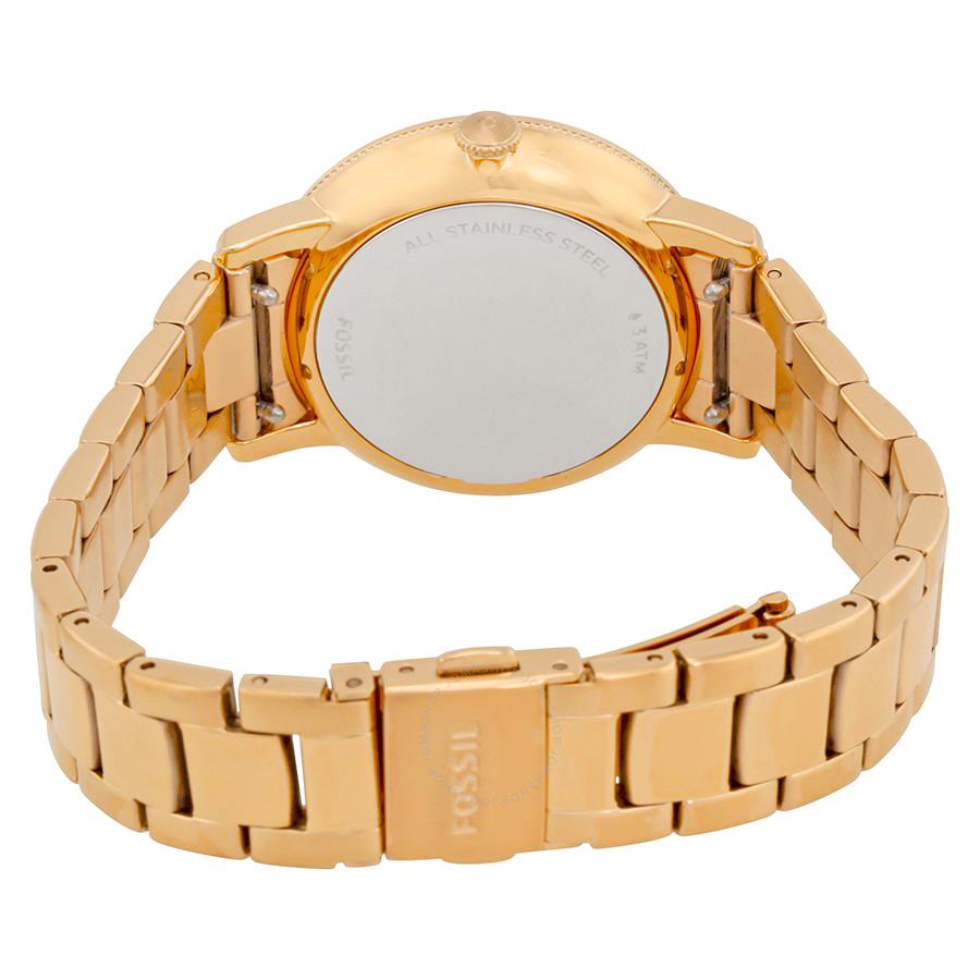 ساعت مچی زنانه/دخترانه فسیلFOSSIL با طراحی مجلسی رزگلد با قاب گرد دور نگین و بند فلزی و صفحه با درج 12 نگین و شبنما و موتور با منبع انرژی باطری این ساعت مچی زنانه به همراه دو سال گارانتی بین المللی شرکت آرمان گالری ارائه میگردد