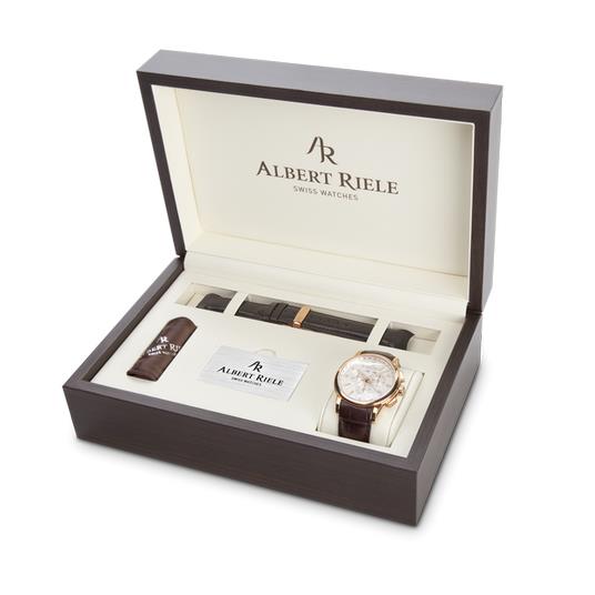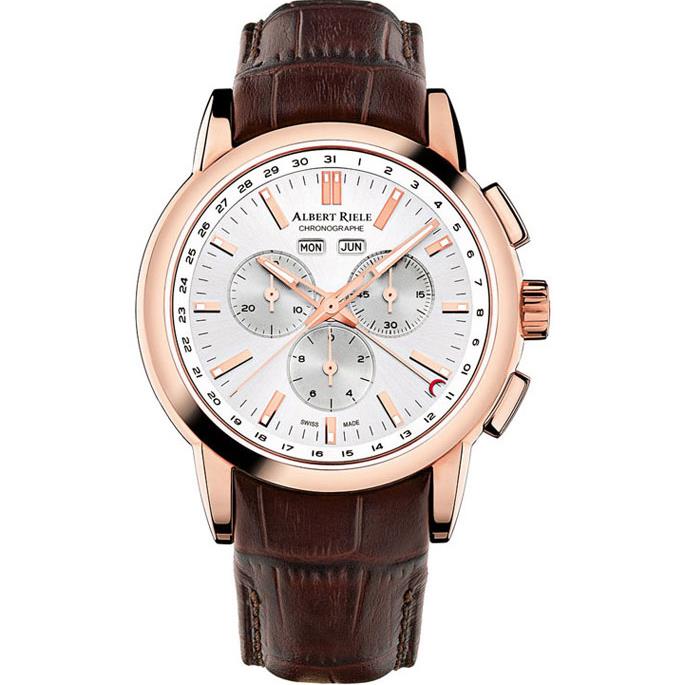 ساعت مچی مردانه/پسرانه آلبرت ریله ALBERT RIELE با طراحی اسپرت بند چرم قهوه ای با قاب گرد رزگلد و صفحه نقره ای با شیشه ضد خش آنتی رفلکس و موتور با قابلیت تقویم و کرنوگراف و از خانواده PREMIERE این ساعت مچی به همراه دو سال گارانتی بین المللی شرکت آناهید زروان ارائه میگردد