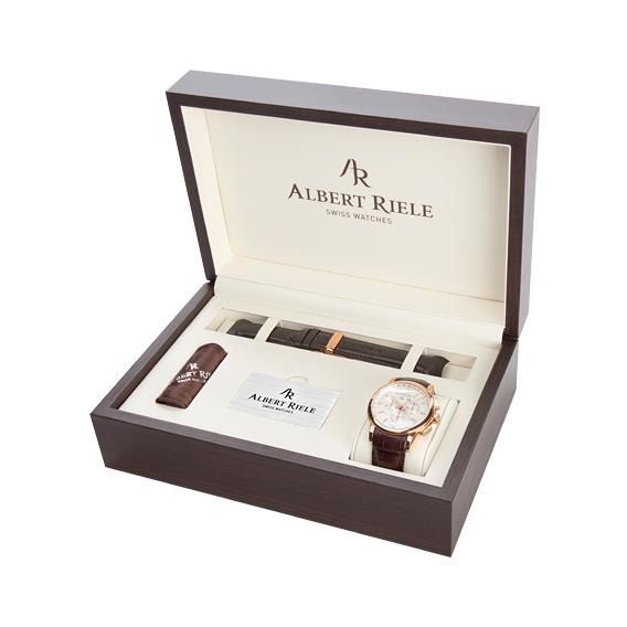 ساعت مچی مردانه/پسرانه آلبرت ریله ALBERT RIELE با طراحی اسپرت بند چرم قهوه ای با قاب گرد رزگلد و صفحه نقره ای و موتور با قابلیت تقویم روز و ماه،ماههای میلادی و کرنوگراف و از خانواده PREMIERE این ساعت مچی به همراه دو سال گارانتی بین المللی شرکت آناهید زروان ارائه میگردد