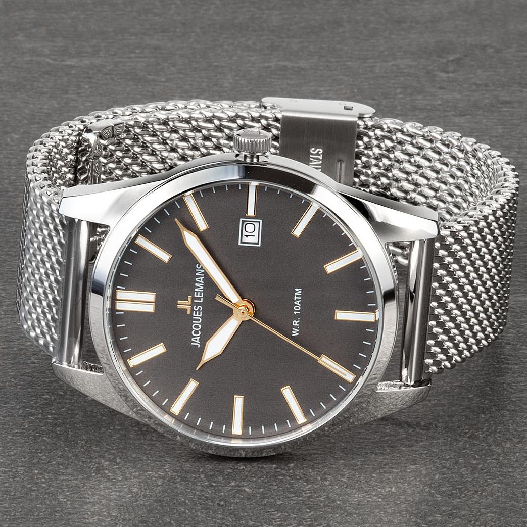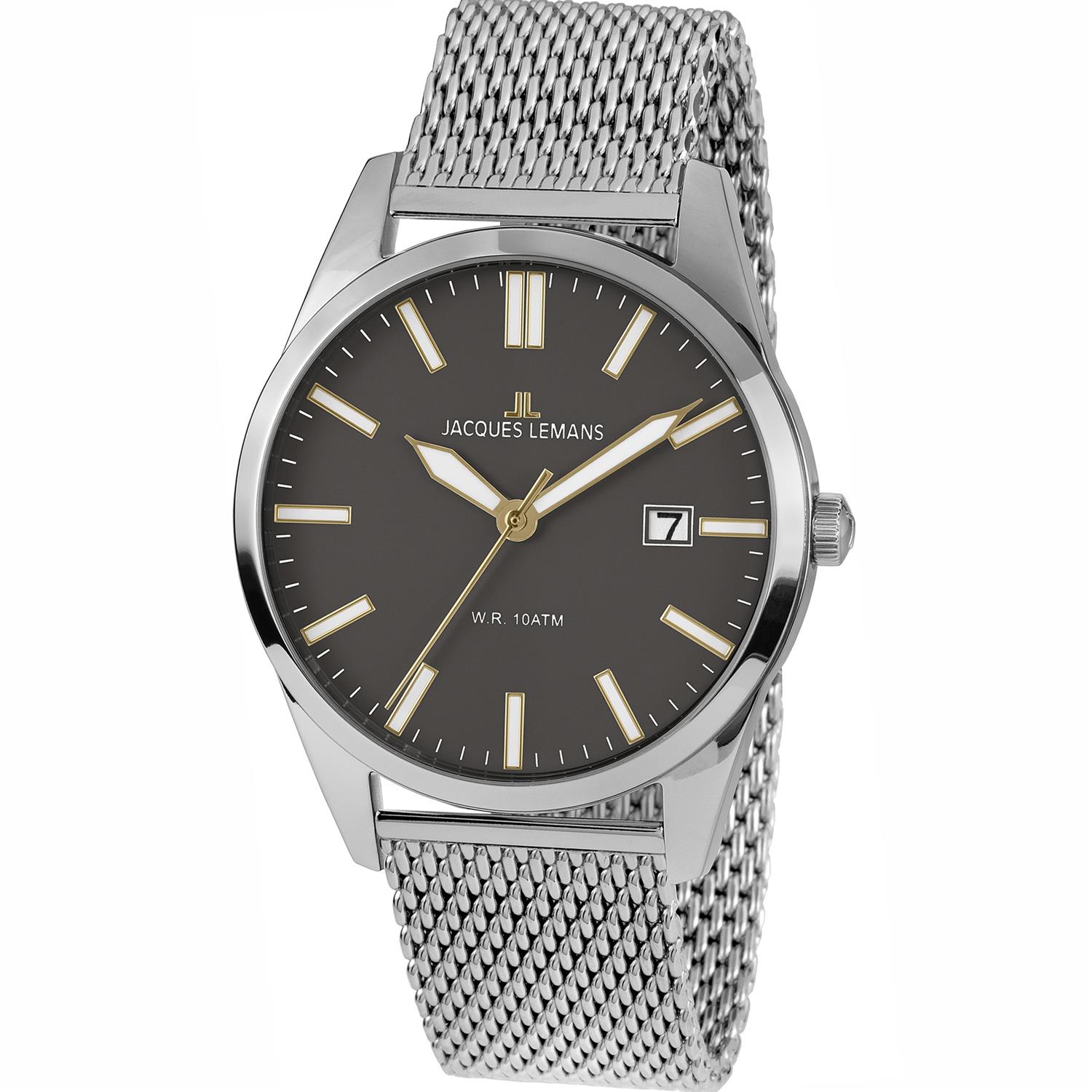 ساعت مچی مردانه/پسرانه ژاک لمن JACQUES LEMANSبا طراحی روزانه بند فلزی حصیربافت با قاب گرد و صفحه طوسی با درج شبنما و موتور با قابلیت تقویم و انرژی باطری از خانواده SERIE 200 این ساعت مچی مردانه به همراه دو سال گارانتی بین المللی شرکت ژاک لمن ارائه میگردد
