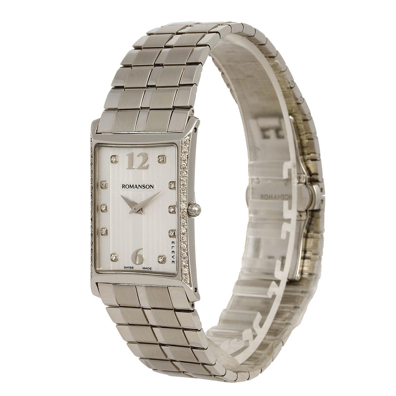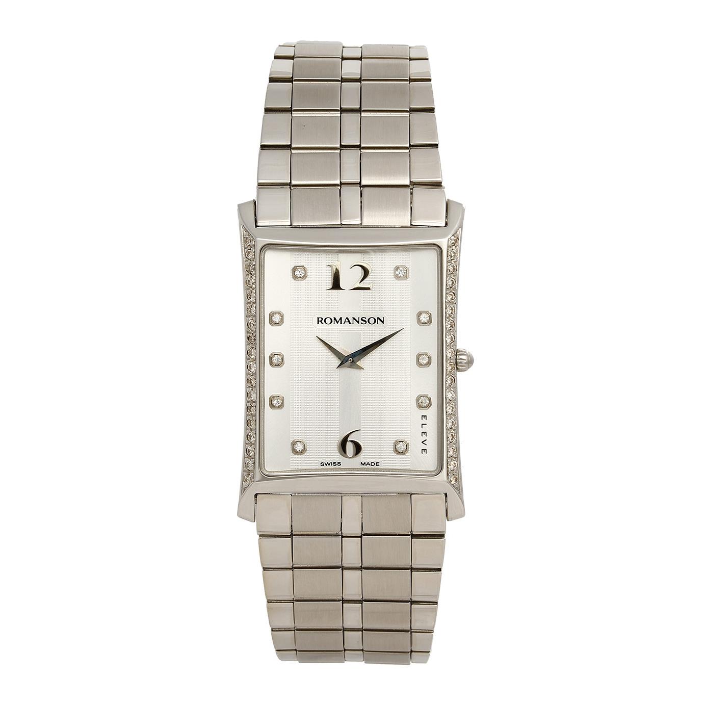 ROMANSON با طراحی مجلسی مردانه با بند فلزی و قاب مستطیل مزین به نگین برلیان با صفحه نقره ای با شیشه ضد خراش و موتور سوییسی با انرژی باطری و مقاوم در برابر آب تا عمق 30 متر از خانواده ELEVE به همراه دو سال گارانتی بین المللی شرکت آناهید زروان