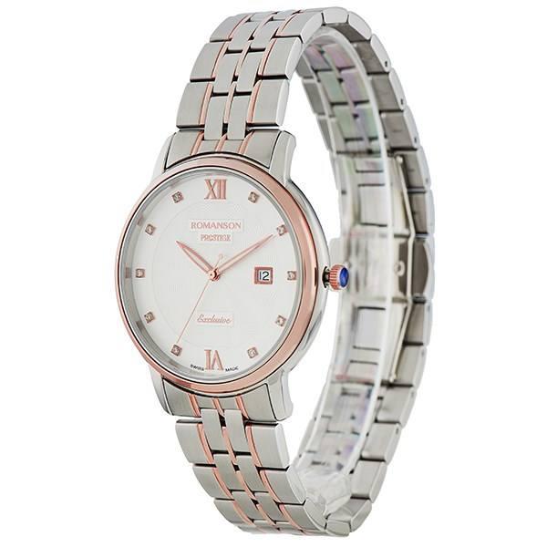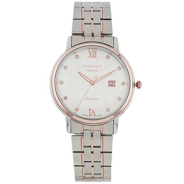 ساعت مچی مردانه/پسرانه رومانسونROMANSON  با طراحی مجلسی دو رنگ بند فلزی با قاب گرد و صفحه نقره ای مزین به نگین برلیان با شیشه ضد خراش و موتور سوییسی با قابلیت تقویم و انرژی باطری و مقاوم در برابر آب تا عمق 30 متر از خانواده PRESTIGE این ساعت مچی مردانه به همراه دو سال گارانتی بین المللی شرکت آناهید زروان ارائه میگردد