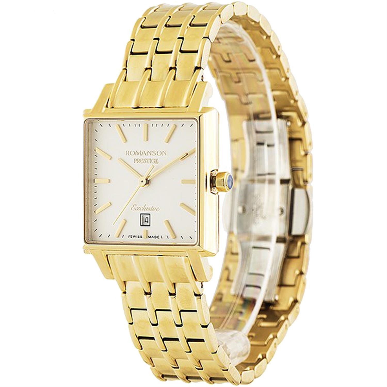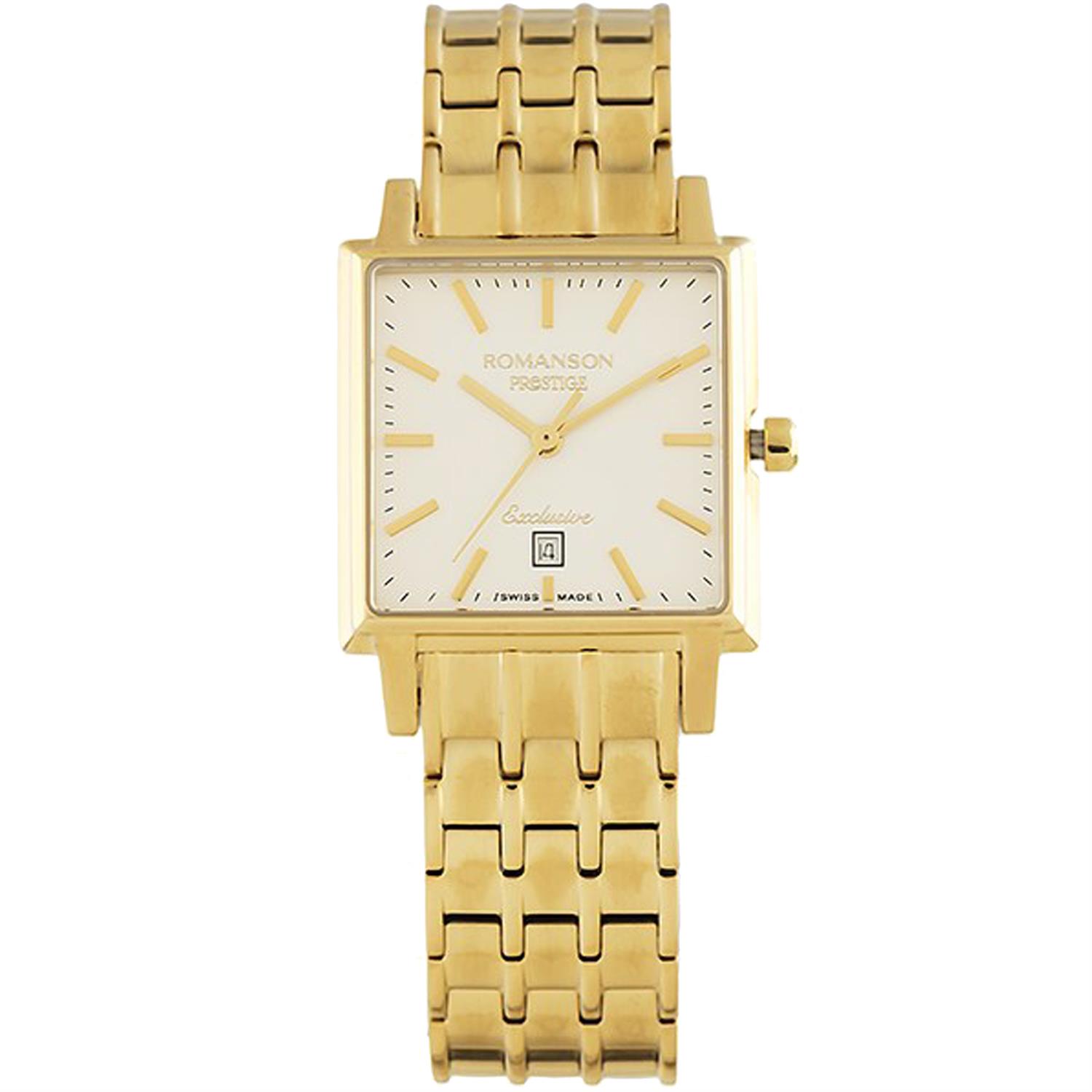 ساعت مچی مردانه/پسرانه رومانسونROMANSON  با طراحی روزانه طلایی رنگ با بند فلزی و قاب مربع با صفحه سفید و شیشه ضد خراش با موتور سوییسی و قابلیت تقویم و انرژی باطری و مقاوم در برابر آب تا عمق 30 متر از خانواده PRESTIGE این ساعت مچی مردانه به همراه دو سال گارانتی بین المللی شرکت آناهید زروان ارائه میگردد