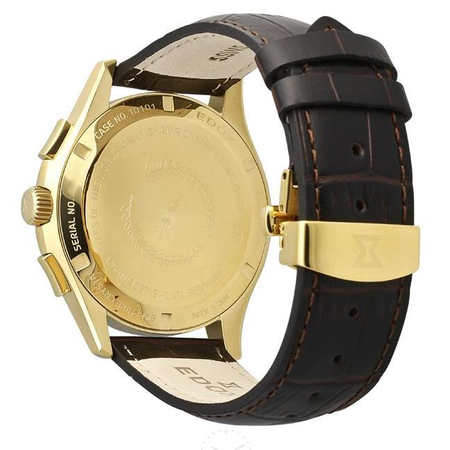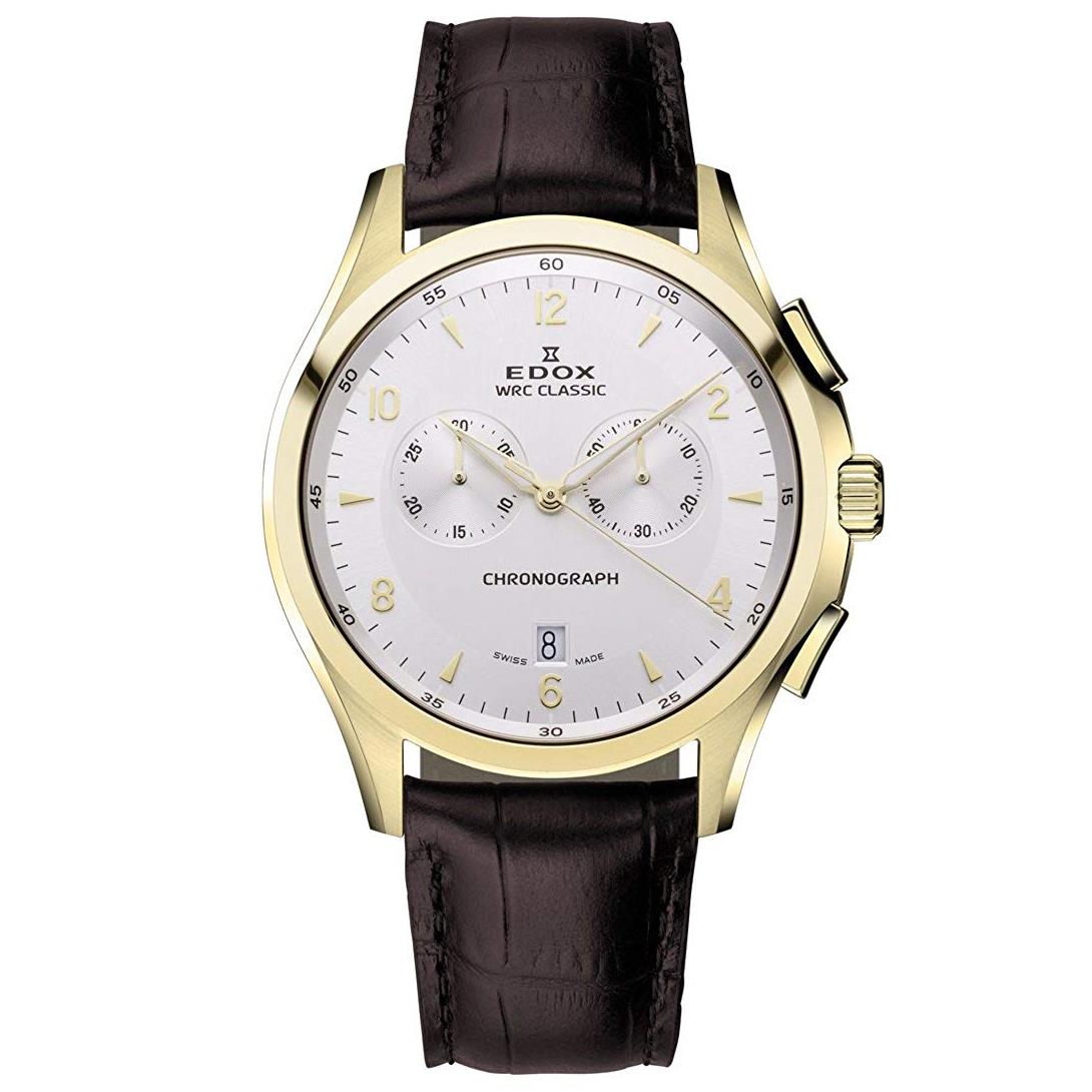 ساعت مچی مردانه/پسرانه ادکس EDOX با طراحی اسپرت بند چرم قهوه ای مجهز به قفل کلیپسی با قاب گرد طلایی و صفحه سفید با شیشه ضد خراش و موتور سوییسی با قابلیت تقویم,کرنومتر با انرژی باطری و مقاوم در مقابل آب تا عمق 50 متر و از خانواده WRC Classic این ساعت مچی مردانه به همراه دو سال گارانتی بین المللی شرکت جام جم ارائه میگردد