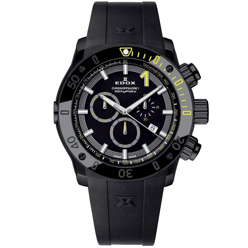 ساعت مچی مردانه/پسرانه ادوکس EDOX  با طراحی اسپرت مشکی رنگ با بند سیلیکونی و قفل کلیپسی با قاب گرد مچهز به زه چرخان,دکمه خروج گاز هلیوم در عمق و شیشه ضد خراش با موتور سوییسی و کاربرد تقویم,کرنومتر با انرژی باطری و مقاوم در مقابل آب تا عمق 500 متر از خانواده Chronoffshore-1این ساعت مچی مردانه به همراه دو سال گارانتی بین المللی شرکت جام جم ارائه میگردد