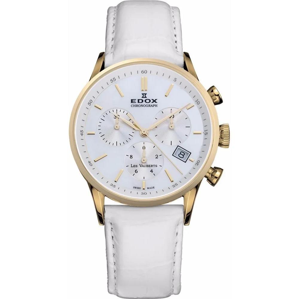 ساعت مچی زنانه/دخترانه ادکس EDOX با طراحی اسپرت بند چرم سفید رنگ با قاب متوسط گرد طلایی رنگ با صفحه سفید صدفی و شیشه ضد خش با موتور کوارتز و قابلیت تقویم,کرنومتر با انرژی باطری و از خانواده Les Vauberts این ساعت مچی زنانه به همراه دو سال گارانتی بین المللی شرکت جام جم ارائه میگردد