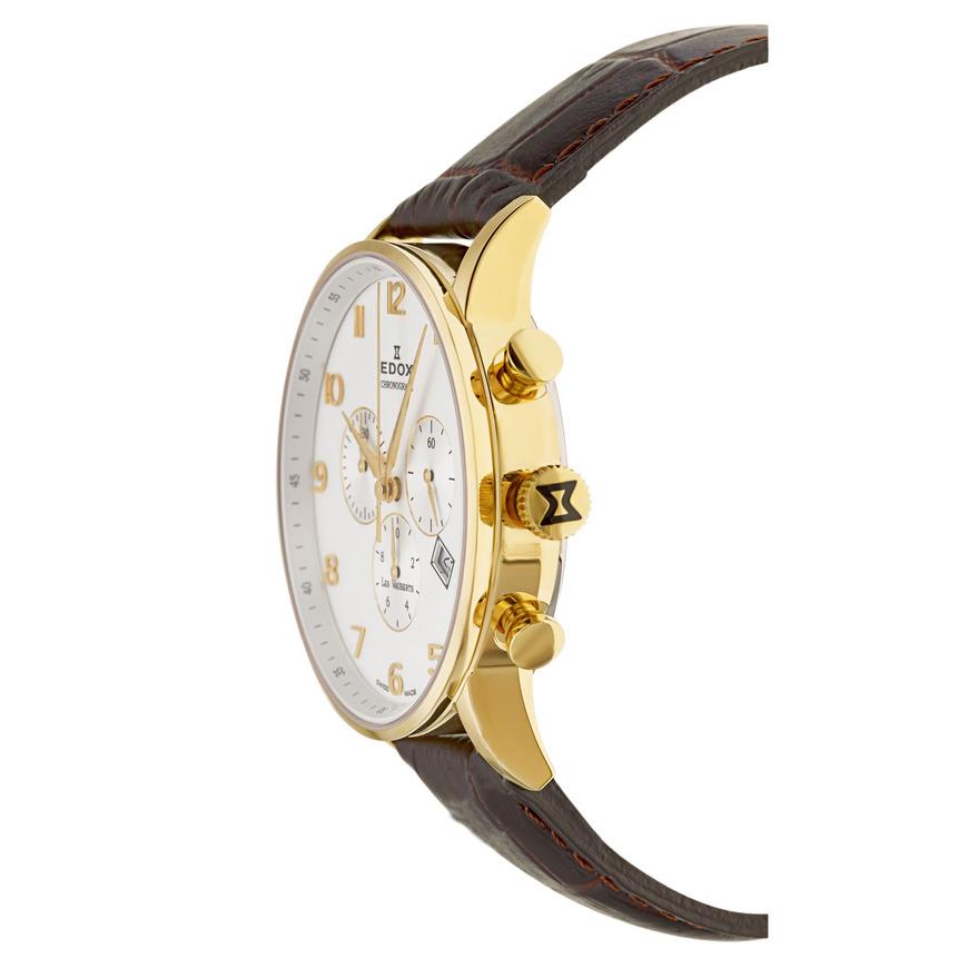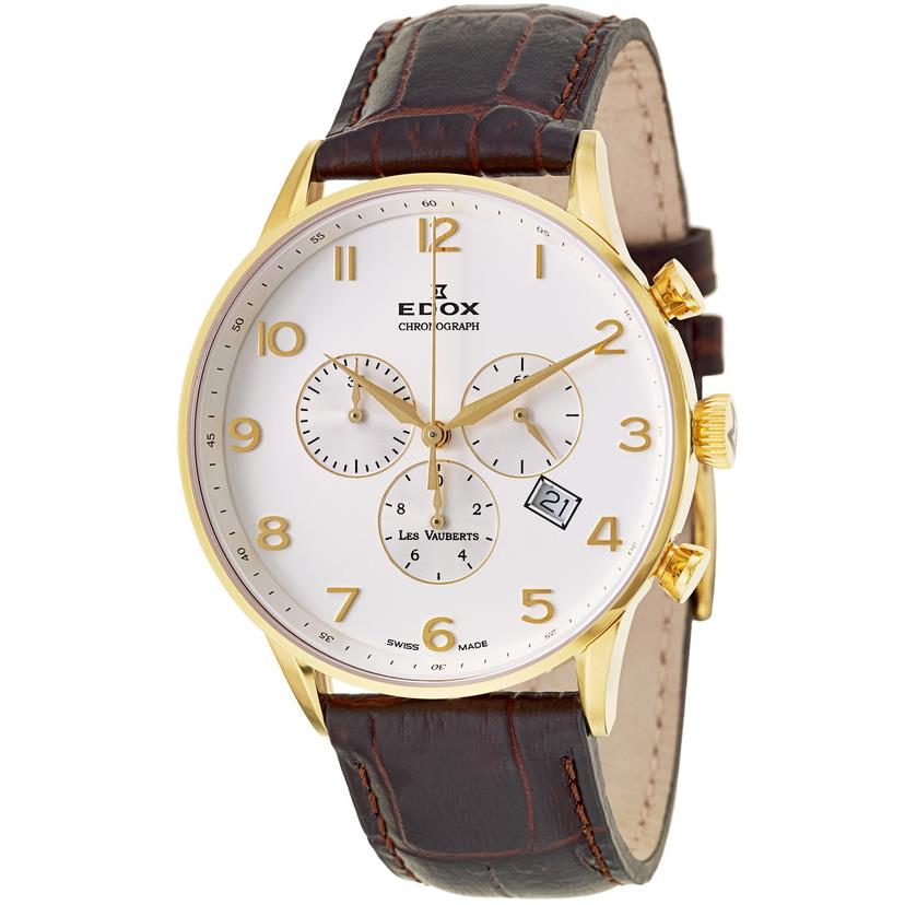 ساعت مچی مردانه/پسرانه ادکس EDOX با طراحی اسپرت بند چرم قهوه ای با قاب گرد طلایی و صفحه سفید با درج اعداد انگلیسی و شیشه ضد خش و موتور با قابلیت تقویم,کرنومتر با انرژی باطری و از خانواده Les Vauberts این ساعت مچی مردانه به همراه دو سال گارانتی بین المللی شرکت جام جم ارائه میگردد