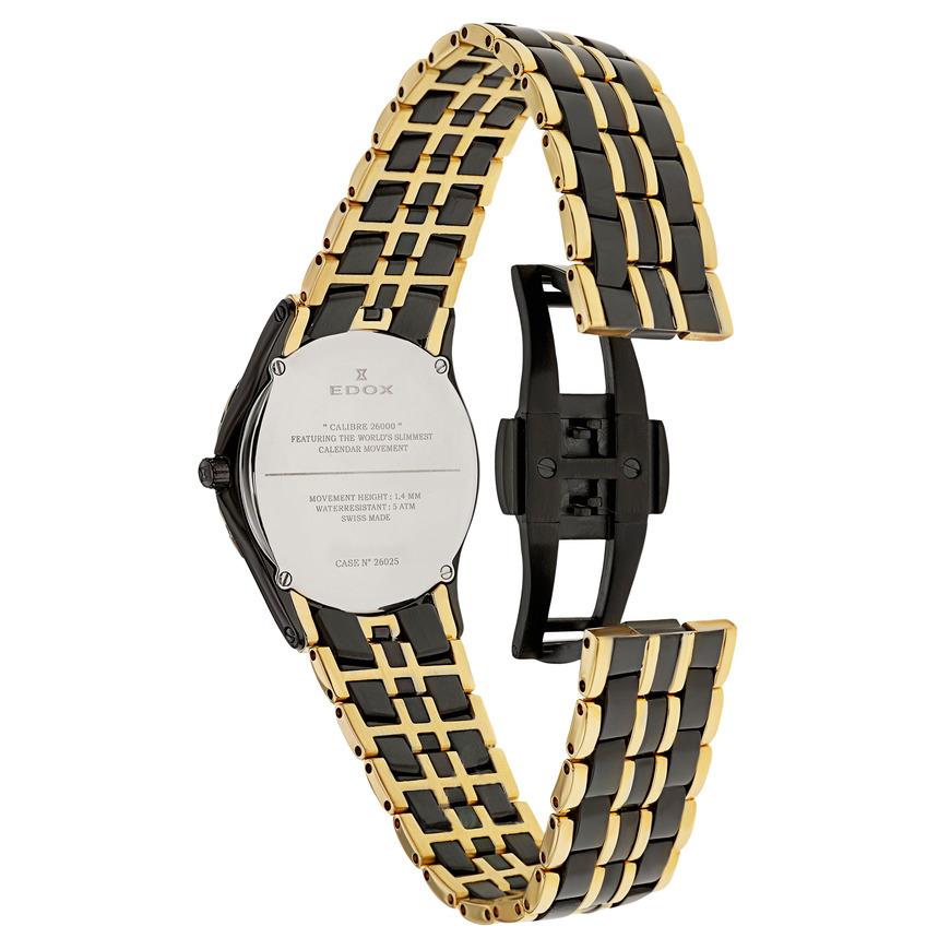 ساعت مچی زنانه/دخترانه ادکس EDOX با طراحی کلاسیک دو رنگ با بند فلزی و قاب بسیار نازک و صفحه مشکی با شیشه ضد خش و موتور با قابلیت تقویم و انرژی باطری و از خانواده Grand Ocean این ساعت مچی زنانه به همراه دو سال گارانتی بین المللی شرکت جام جم ارائه میگردد