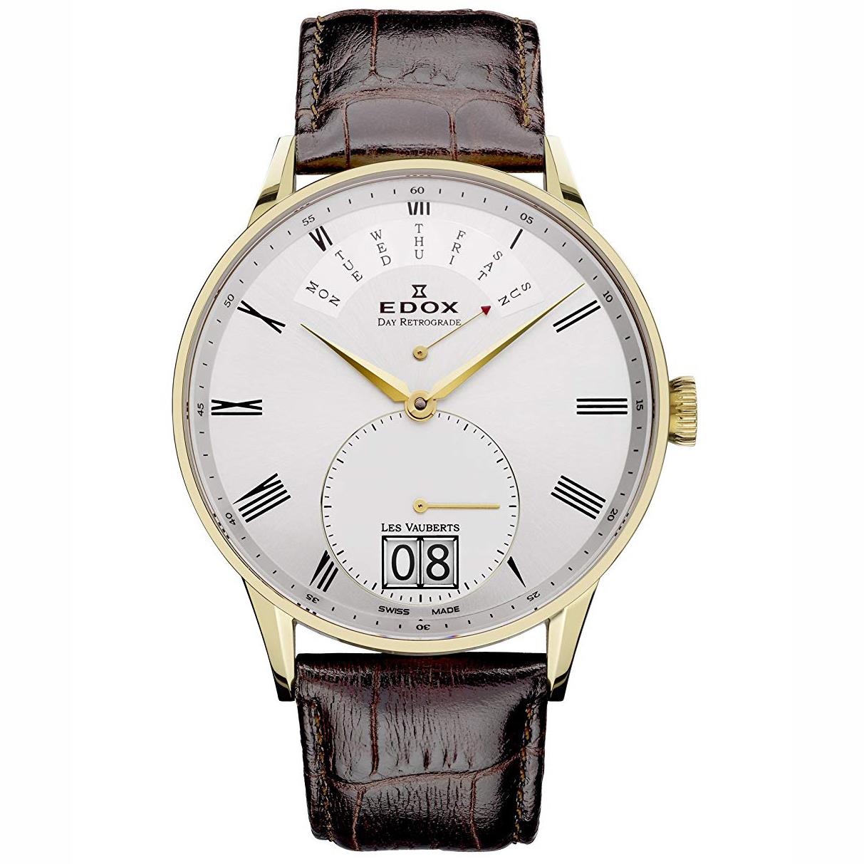 ساعت مچی مردانه/پسرانه ادکس EDOX با طراحی کلاسیک بند چرم قهوه ای با قاب گرد طلایی و صفحه نقره ای مجهز به اعداد یونانی با شیشه ضد خش و موتور با قابلیت تقویم روز و ماه,ثانیه زیر با انرژی باطری و از خانواده Les Vauberts این ساعت مچی مردانه به همراه دو سال گارانتی بین المللی شرکت جام جم ارائه میگردد