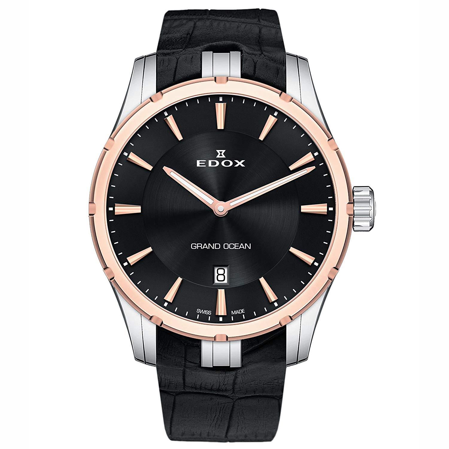 ساعت مچی مردانه/پسرانه ادکس EDOX با طراحی ساده بند چرم مشکی با قاب گرد دو رنگ و صفحه مشکی با درج خطوط و موتور با قابلیت تقویم و انرژی باطری با شیشه ضد خش و از خانواده Grand Ocean این ساعت مچی مردانه به همراه دو سال گارانتی بین المللی شرکت جام جم ارائه میگردد